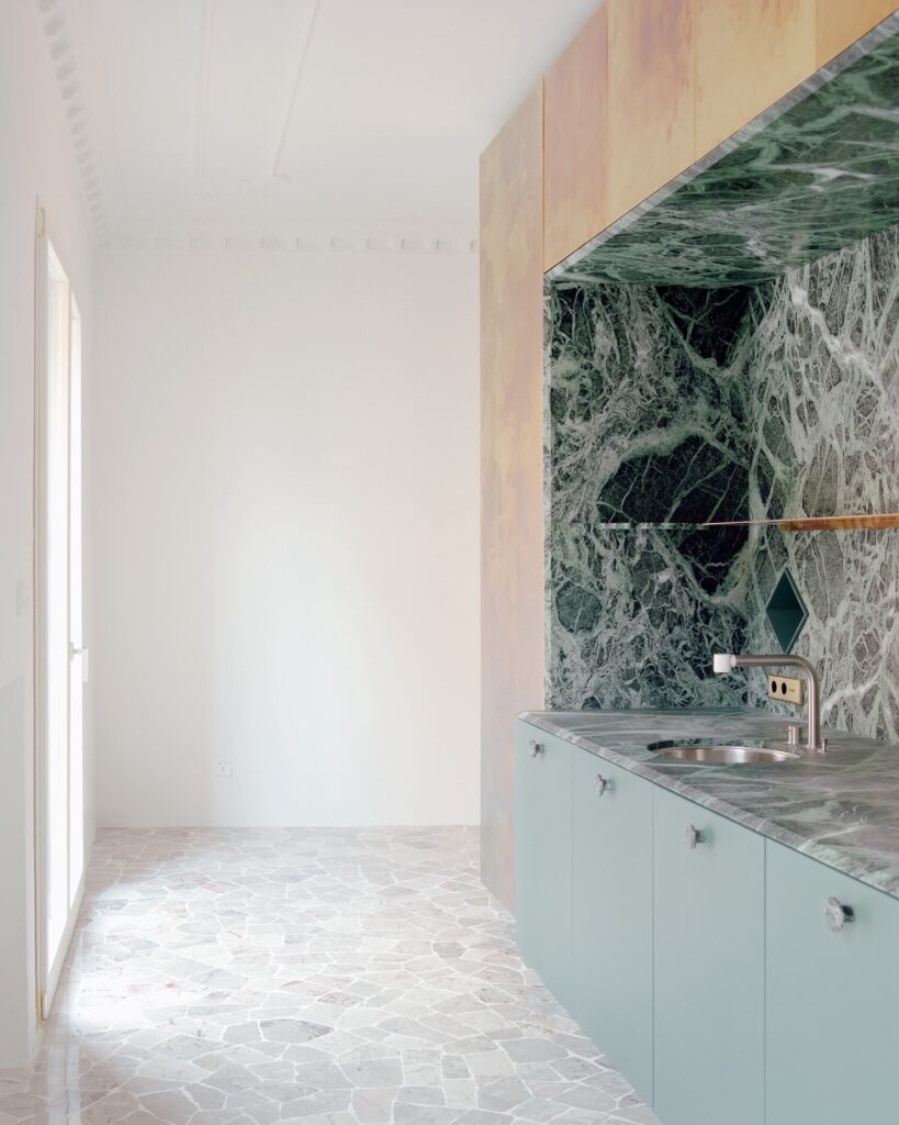 Golden Box é uma arquitetura inserida dentro de outra. Inspirada nos conceitos experimentais de habitar desenvolvidos por alguns mestres do modernismo, esta nova entidade arquitetónica — um paralelepípedo de base quadrada com cinco metros de lado — ocupa quase toda a área de um pequeno apartamento, libertado das suas divisórias internas. O invólucro é inteiramente construído em painéis de latão, que pontualmente cedem lugar a zonas revestidas em mármore verde imperial, sublinhando assim a preciosidade do seu conteúdo.