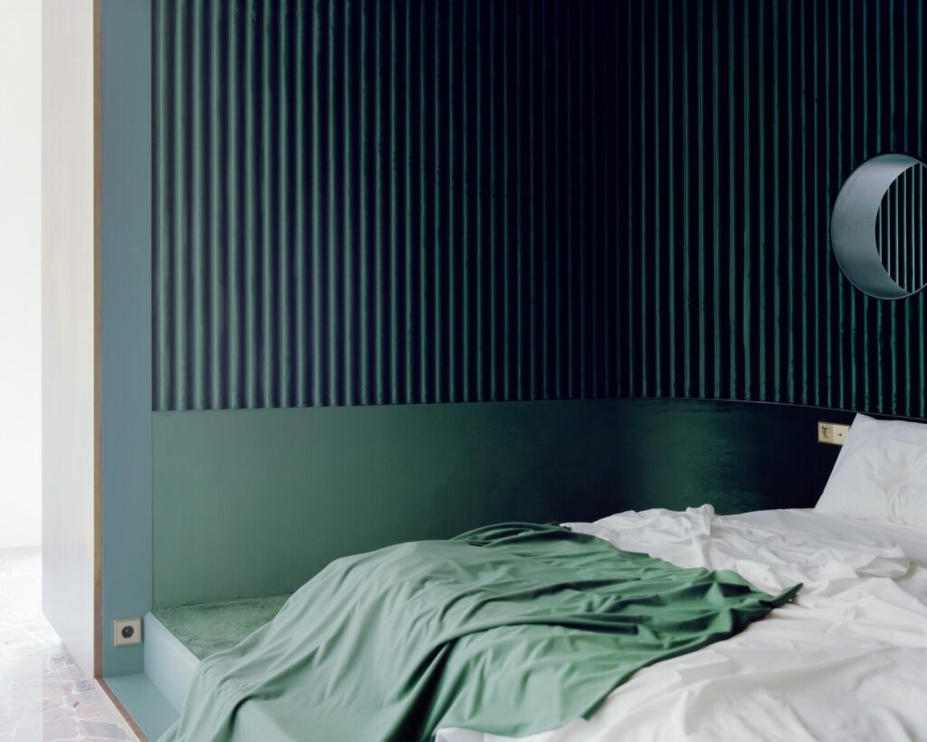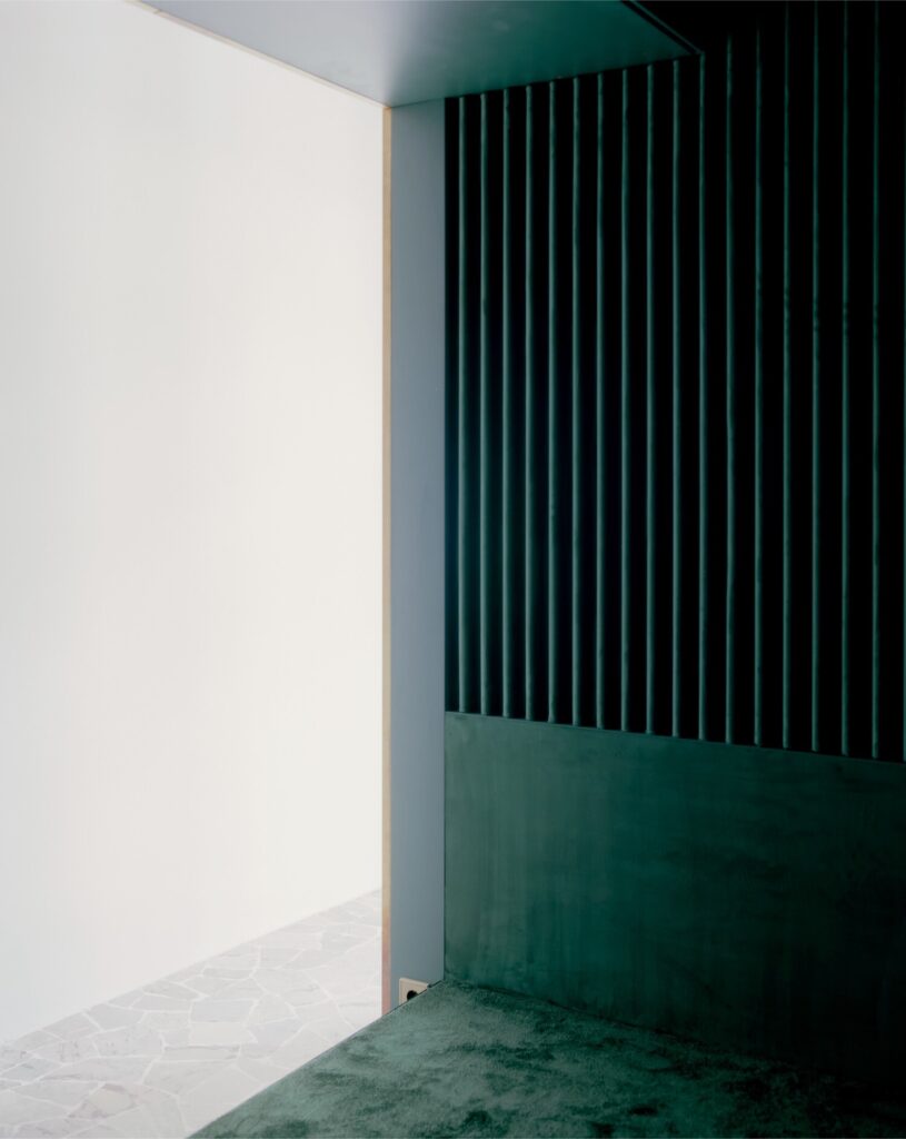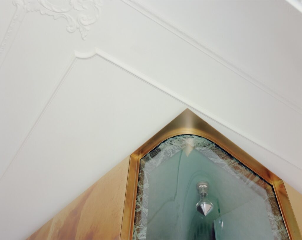 A integração da Golden Box na estrutura existente evidencia uma irregularidade deliberada: em vez de se alinhar com as paredes perimetrais ou com os elementos decorativos do teto, a sua posição cria uma série de desalinhamentos e novas oportunidades, gerando um jogo de expansões espaciais e momentos de surpresa nos espaços intermédios. Esta ligeira deslocação convida o visitante a circundar o objeto, encontrando refúgio apenas no lado onde se estabelece uma condição de paralelismo — junto à cozinha, onde duas janelas se abrem para uma varanda com vista para a rua principal.