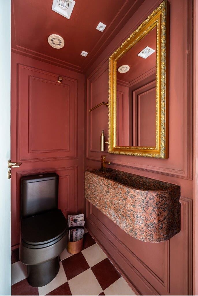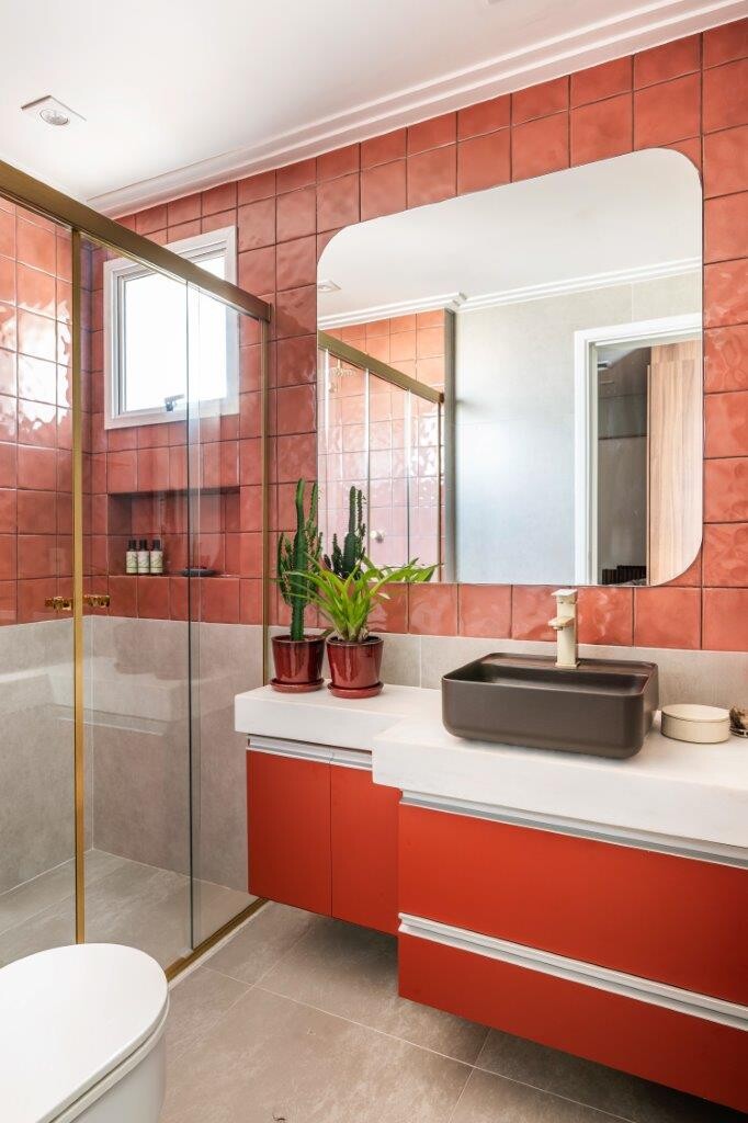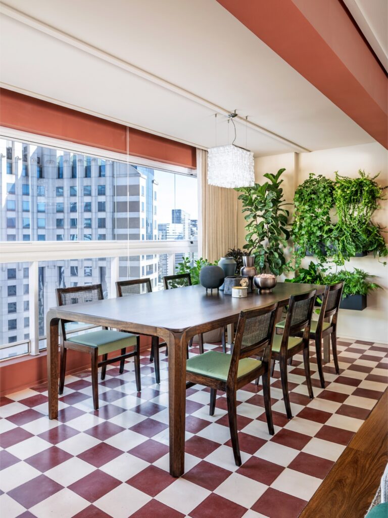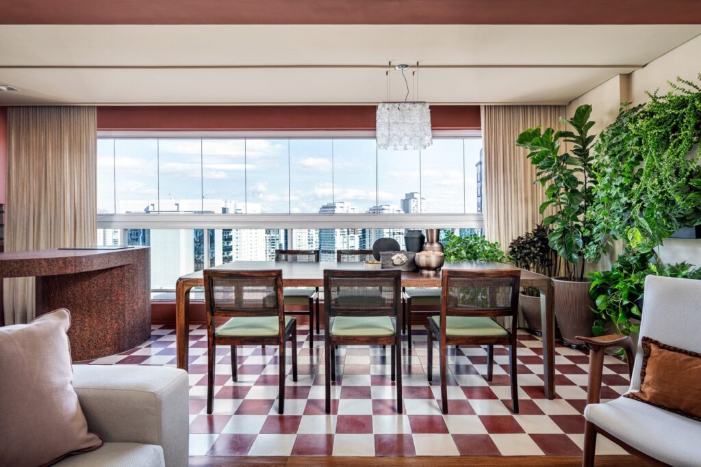 O grande protagonista do projeto é o granito vermelho, uma pedra natural e intemporal que define o tom da casa. Presente na ilha gourmet, no painel da televisão, na cuba esculpida do lavabo e até no tampo da antiga cómoda de madeira — uma peça de herança familiar —, o material serve de fio condutor entre os ambientes. O vermelho também aparece nos mosaicos hidráulicos da Dallepiagge que revestem o pavimento da sala de jantar e do espaço gourmet, desenhados num padrão de xadrez que reforça a estética retro.