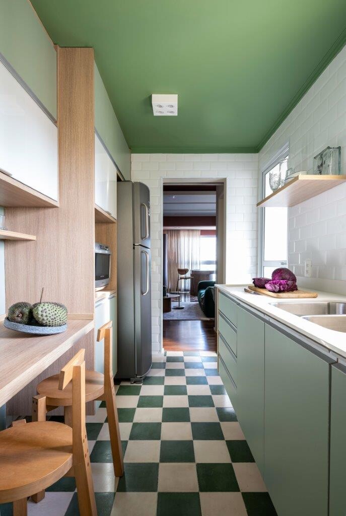 O pavimento original em soalho de madeira cumaru foi mantido, preservando o caráter autêntico do apartamento. No lavabo, as boiseries da Santa Luzia evocam o charme das casas antigas, enquanto na cozinha, o vermelho dá lugar ao verde, num diálogo cromático que remete à estética vintage. Aproveitaram-se os móveis existentes, renovando apenas as portas dos armários — uma solução económica e sustentável que reforça a coerência visual do projeto.