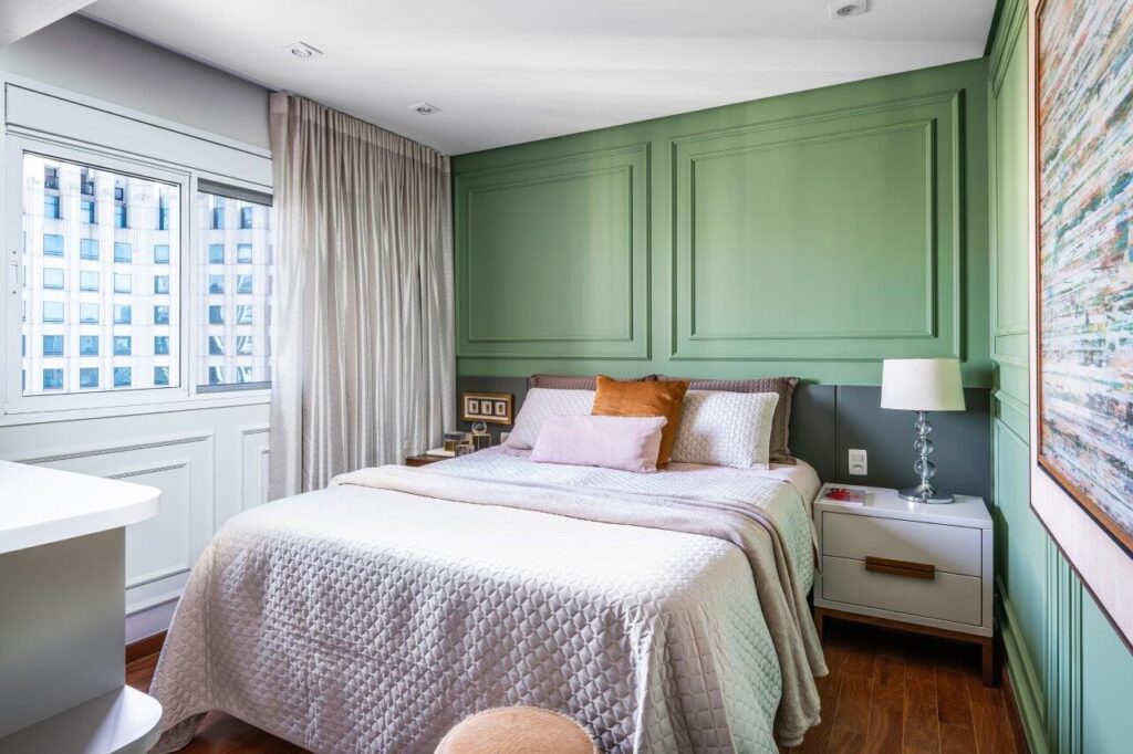 No quarto do casal, as boiseries voltam a aparecer, agora pintadas num tom de verde mais suave, que contribui para um ambiente acolhedor e elegante. A iluminação — técnica da Llum e decorativa a partir do acervo pessoal dos proprietários — acentua a textura dos materiais e cria diferentes atmosferas ao longo do dia.