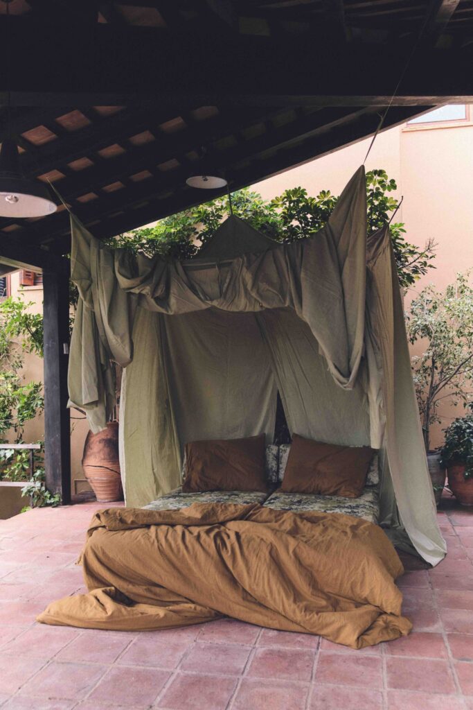2. Dossel de cama Morning Dew da HK Living, em 100% algodão, com aberturas nos quatro lados, pode ser enrolado ou atado em cada canto. Na Pura Cal.