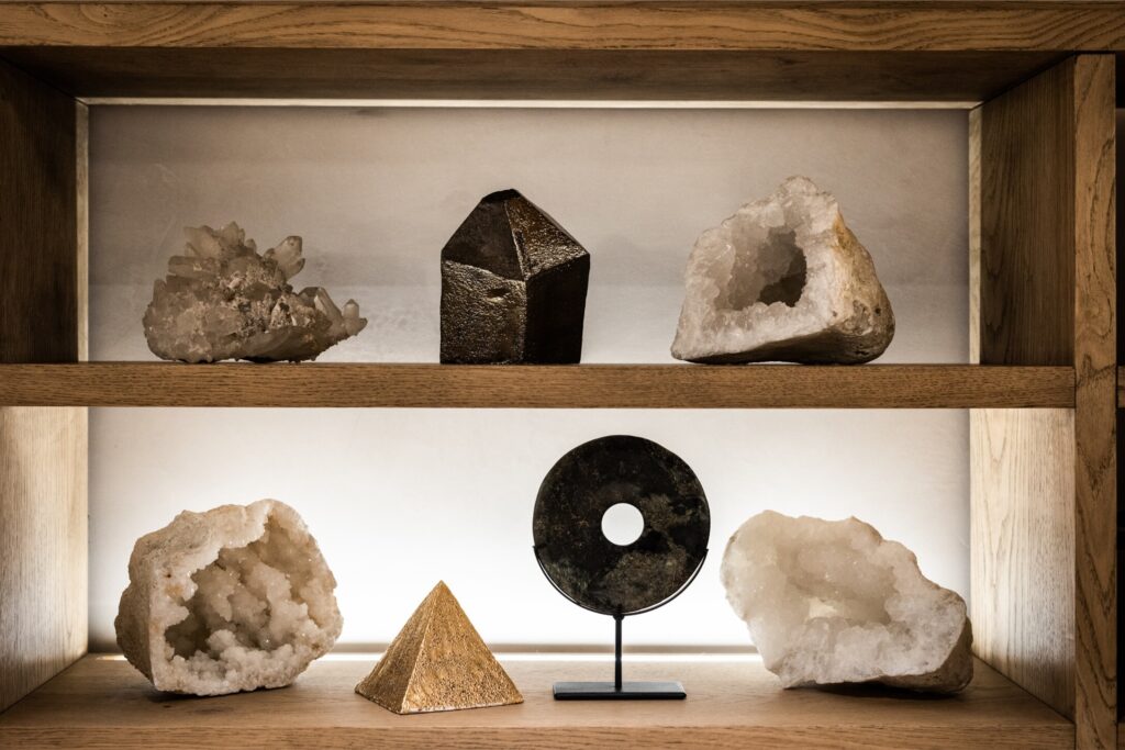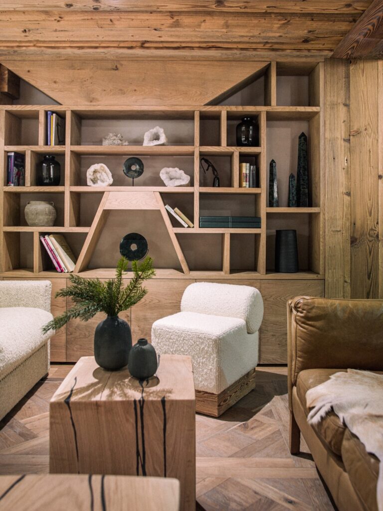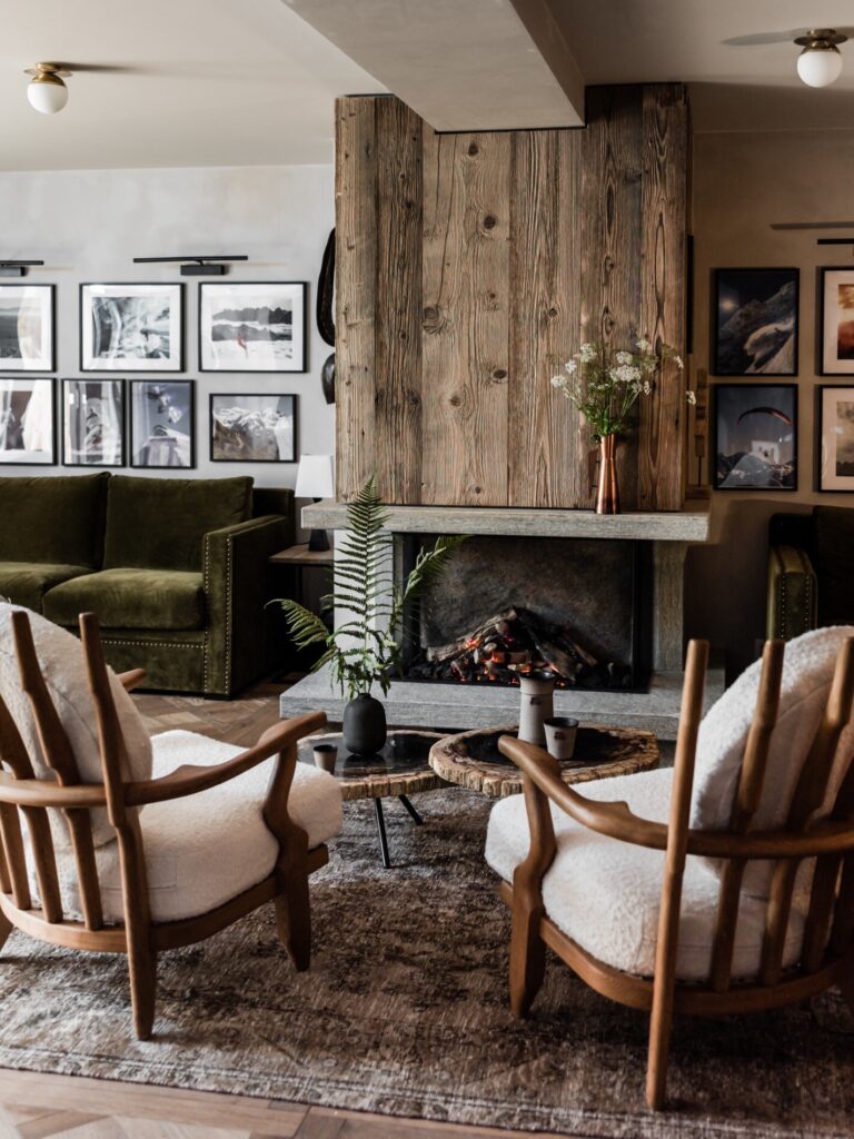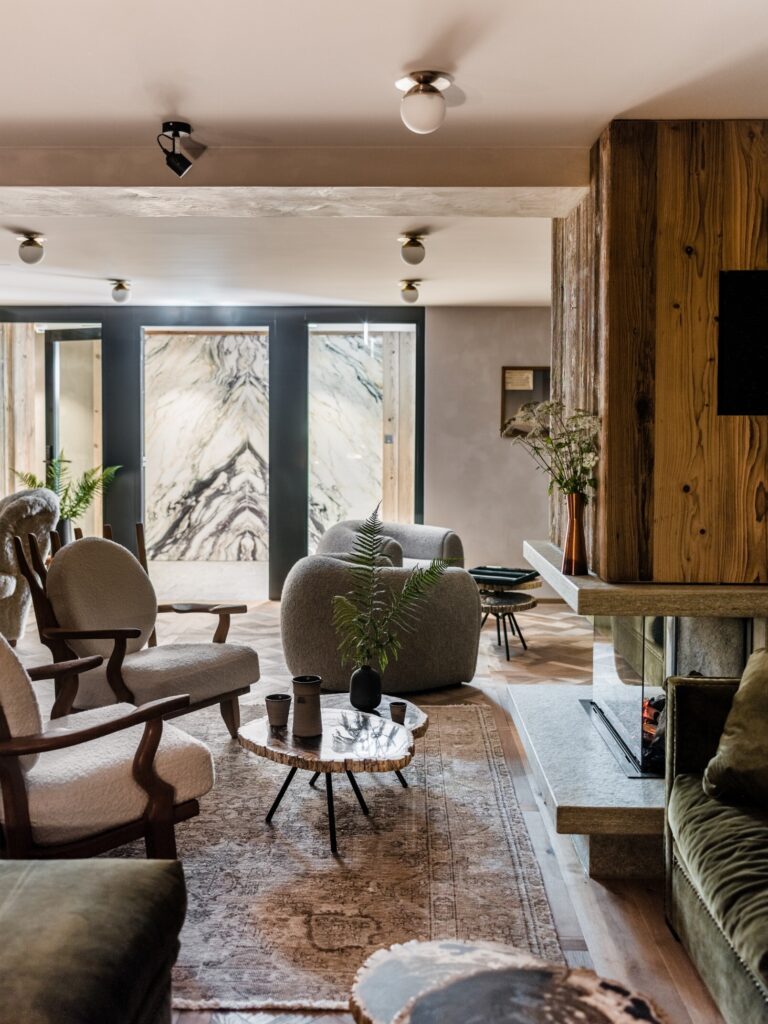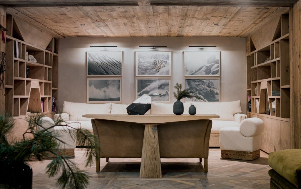 Pensados como uma ode à natureza, os espaços interiores apresentam mobiliário e acessórios feitos por medida, inspirados em motivos típicos da década de 1930 — incluindo tapetes, pormenores de estofo em cortinados, tachas nas cabeceiras e prateleiras — que dialogam com criações alpinas primitivas, assim como com fotografias de montanha e de esqui. Peças icónicas de design de Jacques Adnet, Pierre Chareau e Guillerme et Chambron, entre outros, completam a atmosfera acolhedora.