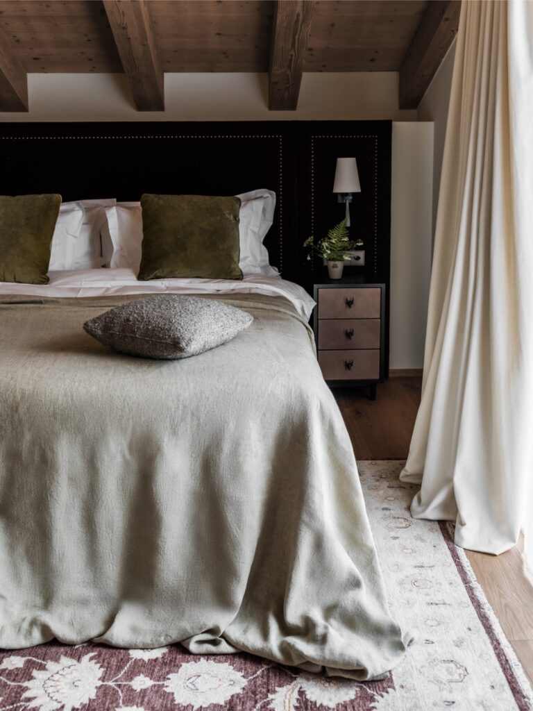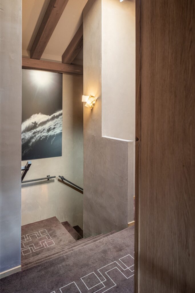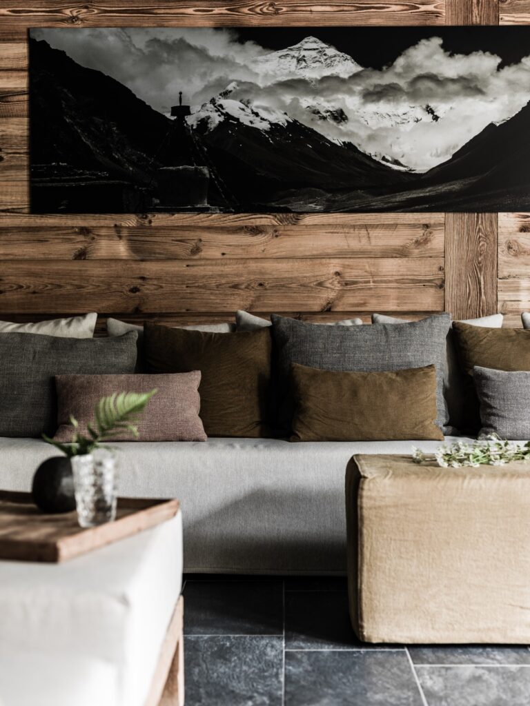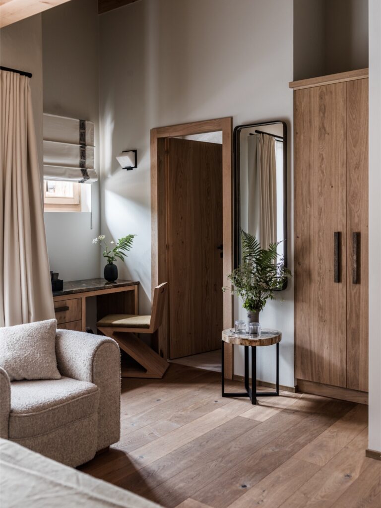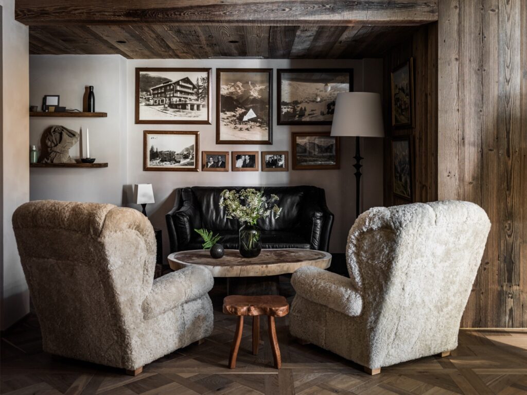 Com 32 quartos, um ginásio e um spa boutique, o hotel dispõe de amplas varandas que oferecem vistas excecionais sobre os Alpes. A beleza da paisagem envolvente inspirou a paleta cromática de tons naturais e terrosos — dos verdes e castanhos aos cremes e ferrugem —, enquanto madeiras locais recuperadas, tintas minerais, lãs suíças e escocesas, bem como linho belga, foram usados em todo o projeto.