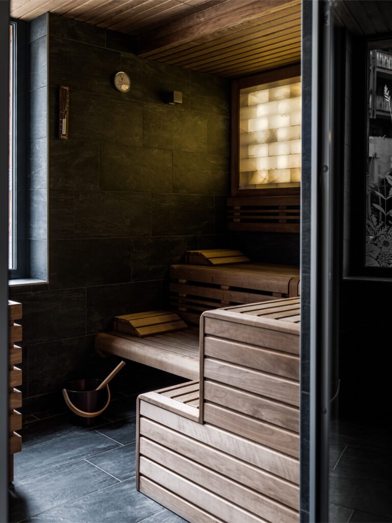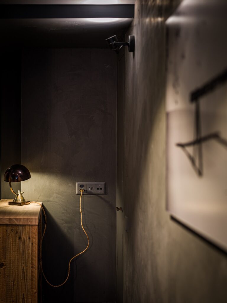 No SPA, encontramos bancos e pufes em linho orgânico belga, também desenhados para o hotel, espelhos em madeira recuperada e uma cadeira lateral alpina primitiva. Nota também para os apliques de parede Original BTC.