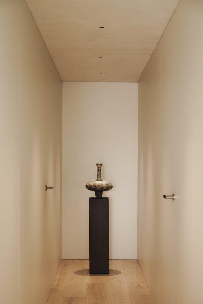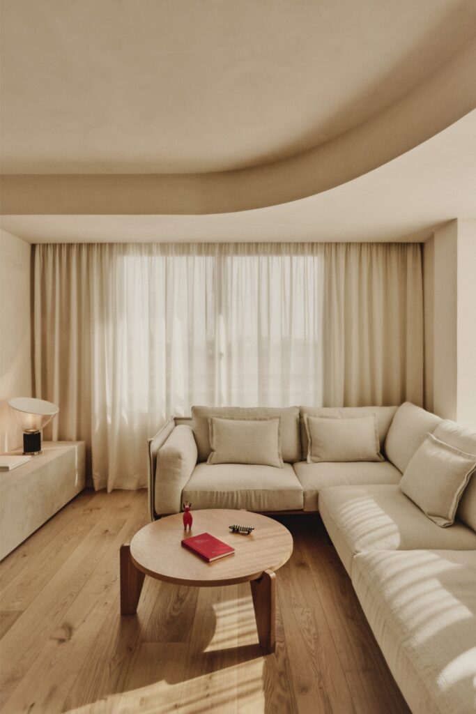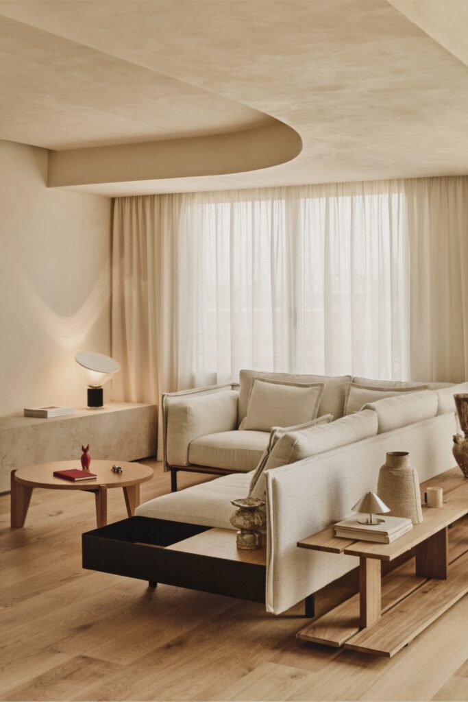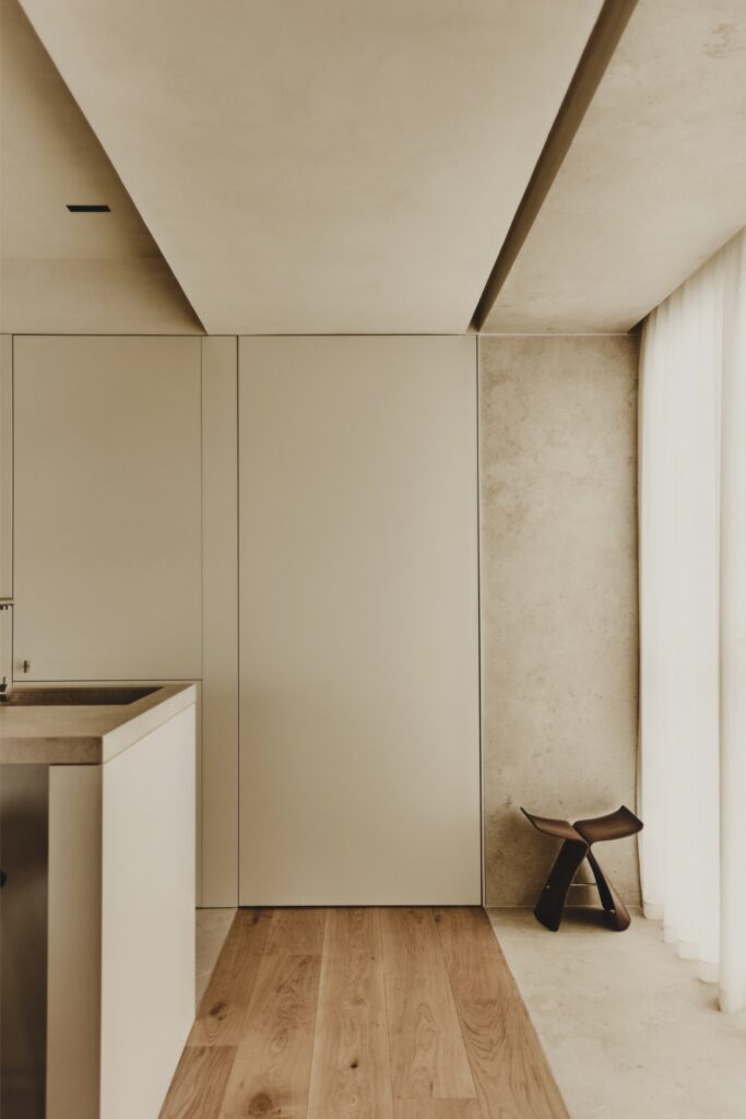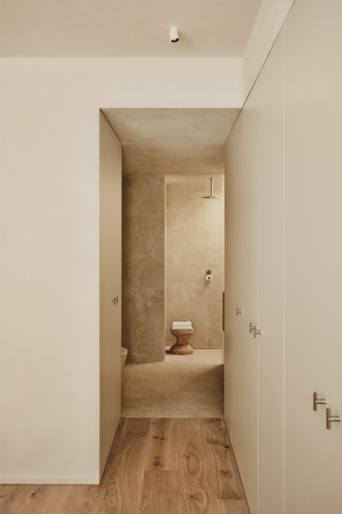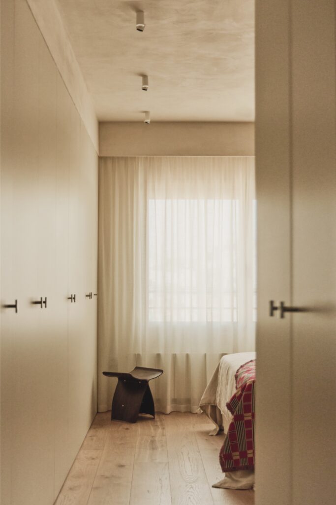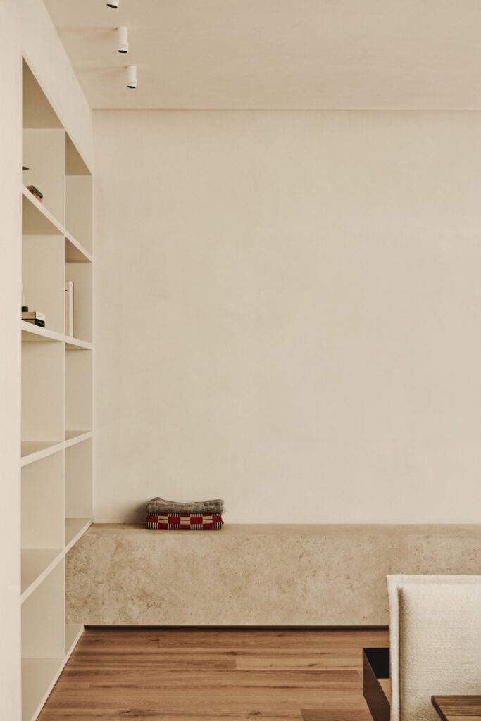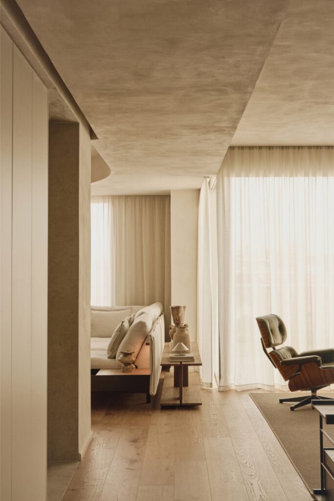 “Desde o primeiro momento, o apartamento revelou-se como um manifesto de calma e coerência”, explicam os arquitetos. Paredes e tetos foram revestidos com estuque de cal, conferindo uma textura subtil e natural que reforça a sensação de refúgio elegante. No pavimento, o carvalho francês contínuo aquece o espaço, enquanto a luz natural — protagonista silenciosa do projeto — desliza suavemente sobre cada superfície.