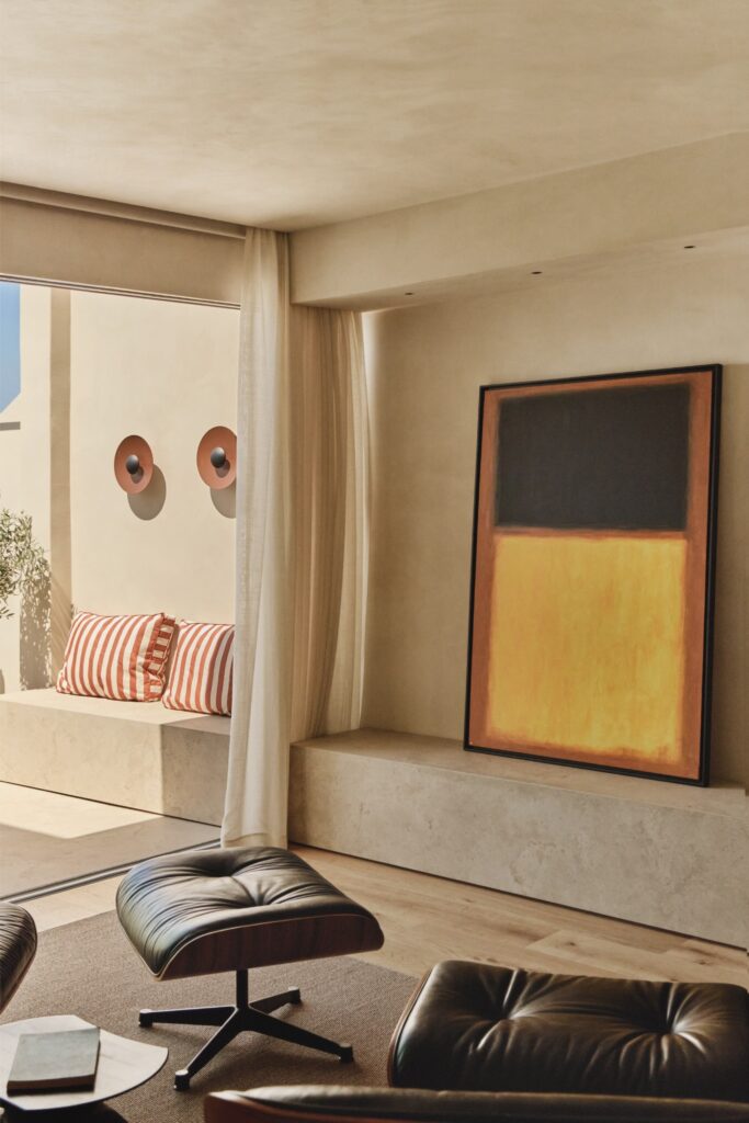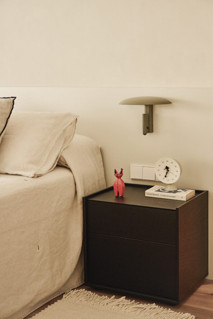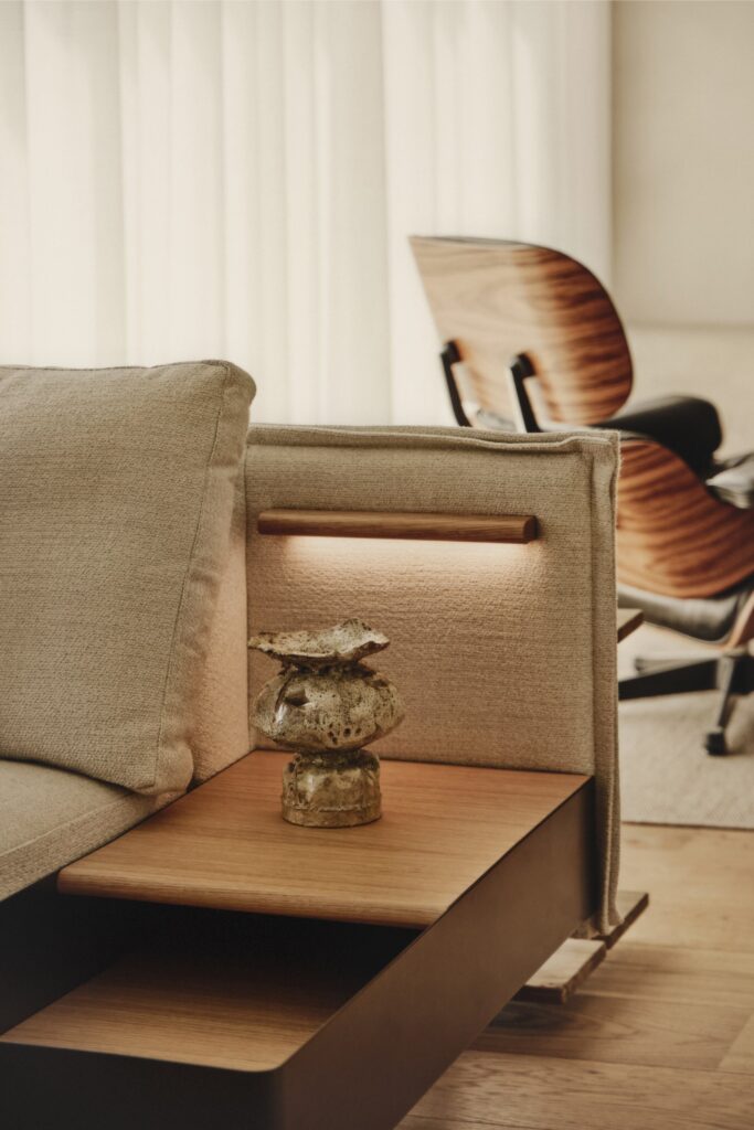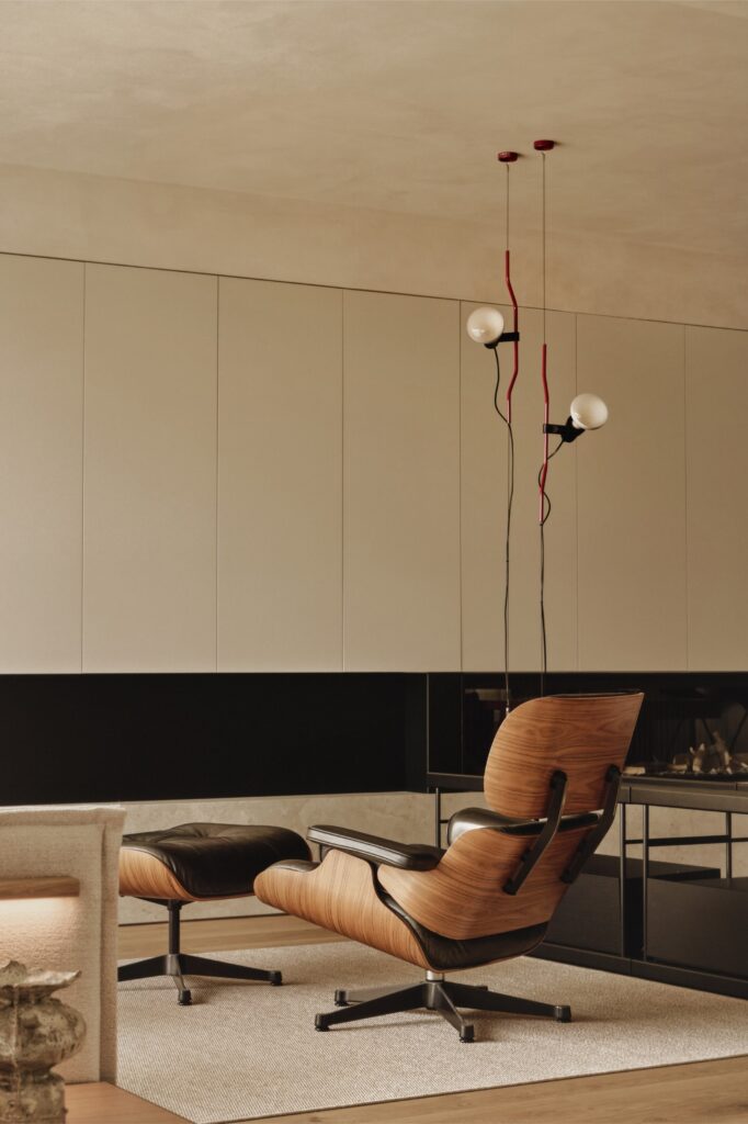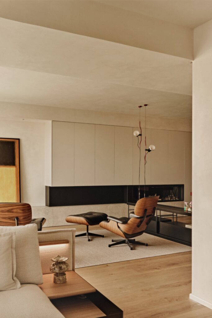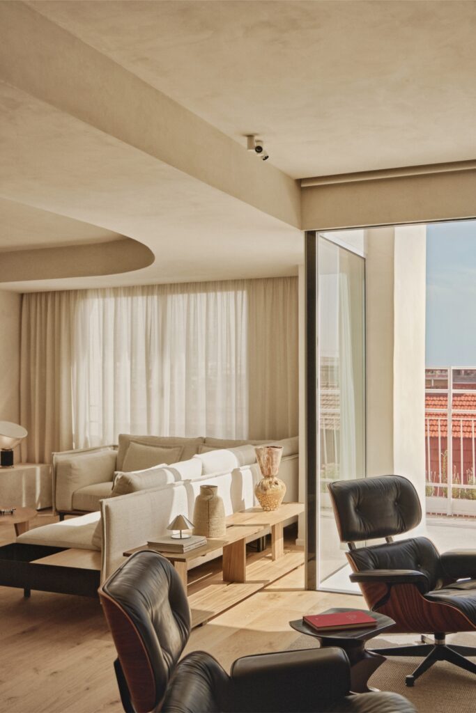 O estúdio x.arquitectos apresenta aqui uma linguagem estética neutra, onde os materiais nobres não são mera ornamentação, mas sim a base da própria experiência espacial. O mobiliário, criteriosamente selecionado, equilibra peças icónicas do design internacional com objetos artesanais enraizados na tradição local. Na sala de estar, um generoso sofá da Joquer combina-se com uma mesa de centro de Jean Prouvé, enquanto duas poltronas Eames Lounge oferecem elegância e um convite evidente ao descanso. Um tapete em tons suaves enquadra a área, ancorando visualmente o espaço sem interromper o seu fluxo.