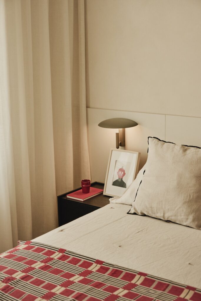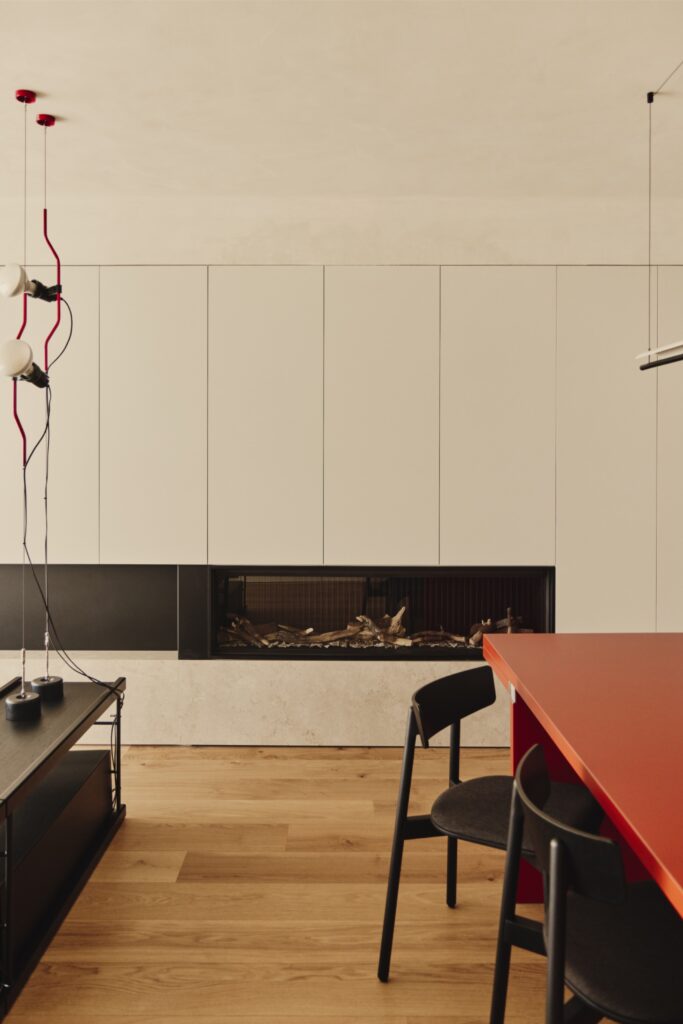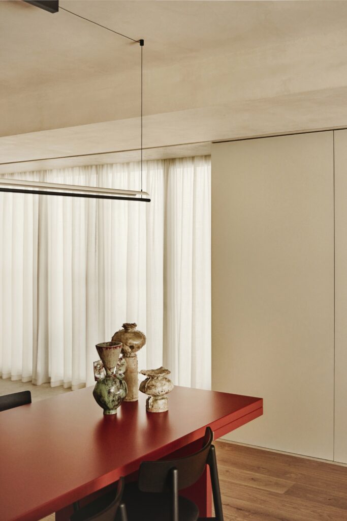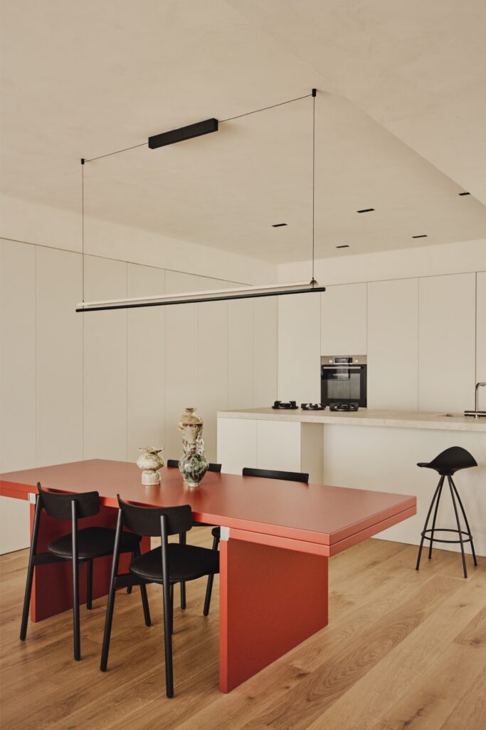 A zona de jantar assume-se como outro ponto focal, dominada por uma mesa escultórica vermelha de Carlo Scarpa para a Cassina. A peça introduz uma narrativa subtil, mas poderosa, através da forma e da cor. Os elementos envolventes — assentos e iluminação da Santa & Cole — complementam sem competir, escolhidos pela sua calidez e discrição.