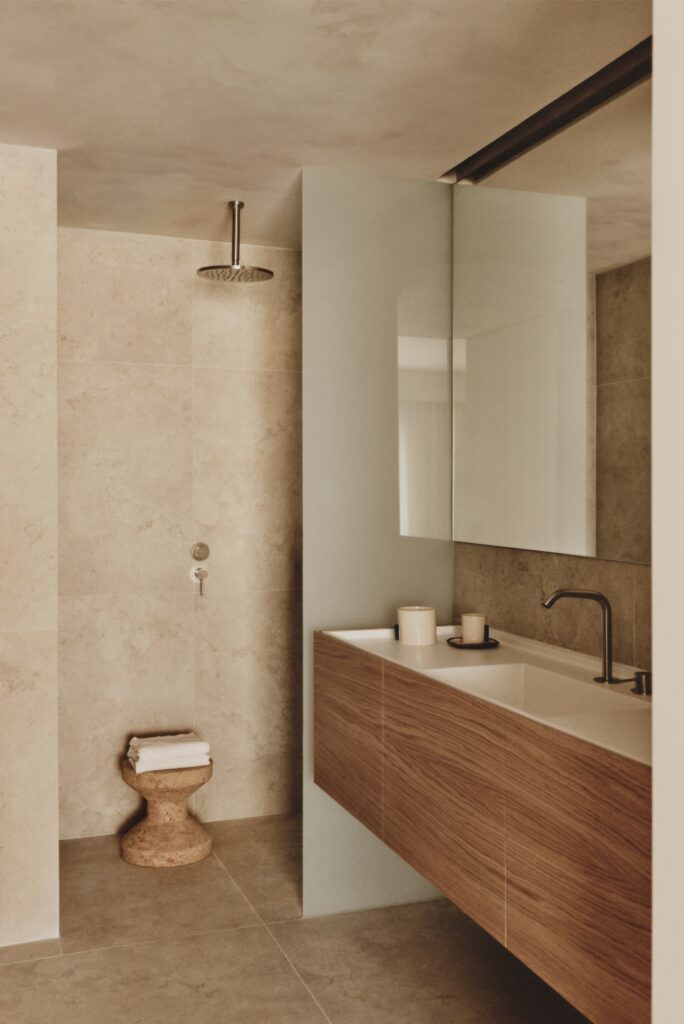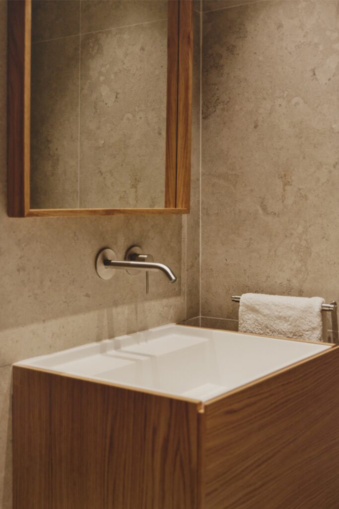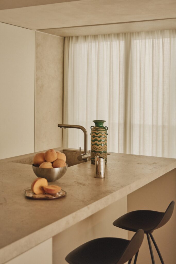 A cozinha é definida por uma ilha marcante em porcelânico da Living Ceramics, um material selecionado pela sua resistência, elegância e fácil manutenção. A mesma superfície estende-se aos bancos integrados, tanto no interior como no exterior, garantindo unidade visual e consistência tátil. Nas casas de banho, a coleção Frame — desenhada pelo próprio atelier x.arquitectos para a Resigres — combina carvalho natural e grés porcelânico, em consonância com a paleta de materiais da casa. Detalhes como torneiras e puxadores em aço inox escovado, da Formani, reforçam a elegância discreta que define todo o projeto.