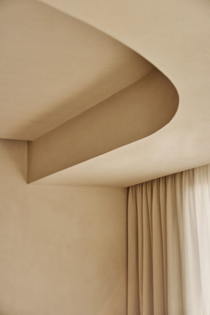 Cortinas de linho natural filtram a luz com uma textura suave e fluida, garantindo privacidade sem comprometer a luminosidade. A iluminação técnica da Arkos Light integra-se com precisão, realçando volumes e superfícies sem perturbar a harmonia visual do conjunto.