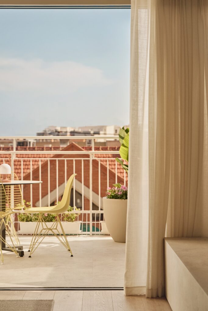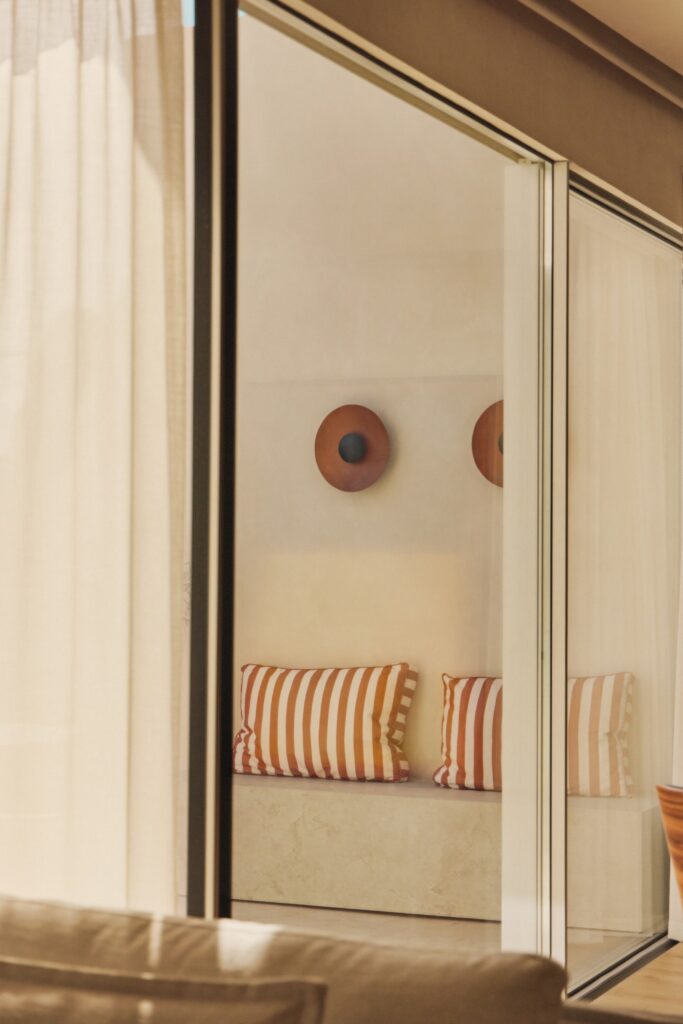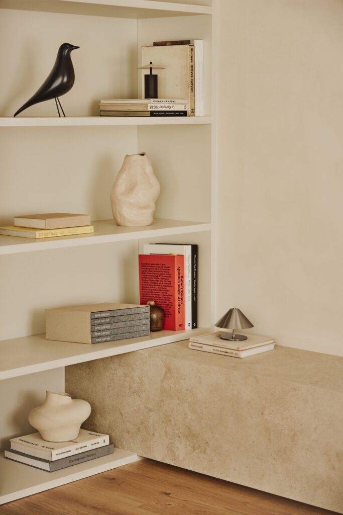 Um dos gestos mais poéticos encontra-se na transição imperceptível entre interior e exterior. Um banco contínuo une ambas as áreas, esbatendo fronteiras e valorizando as vistas privilegiadas sobre a cidade. No terraço, o mobiliário da Vitra e a iluminação da Marset prolongam a sofisticação serena do interior. Vasos em cerâmica artesanal da Canoa Lab surgem espalhados por toda a casa, enraizando o design na cultura artesanal mediterrânica.