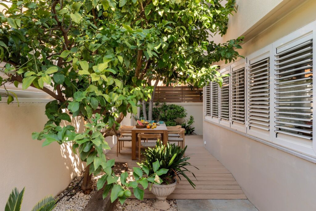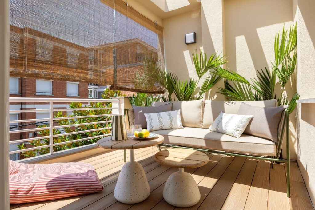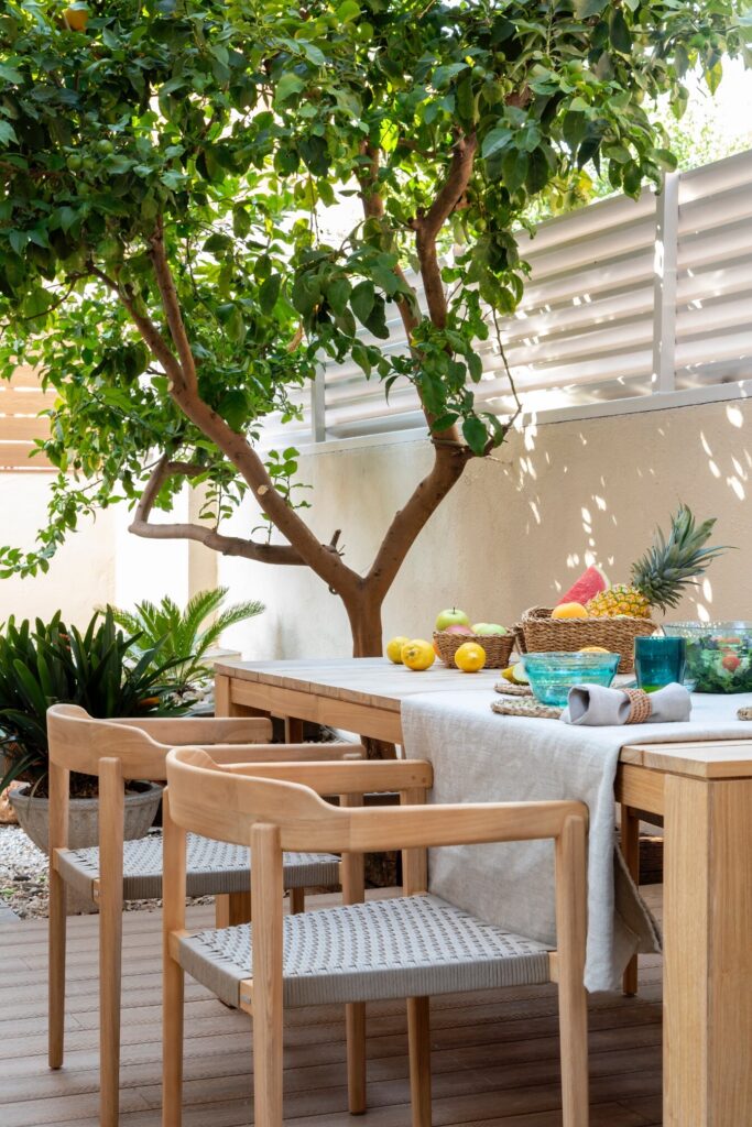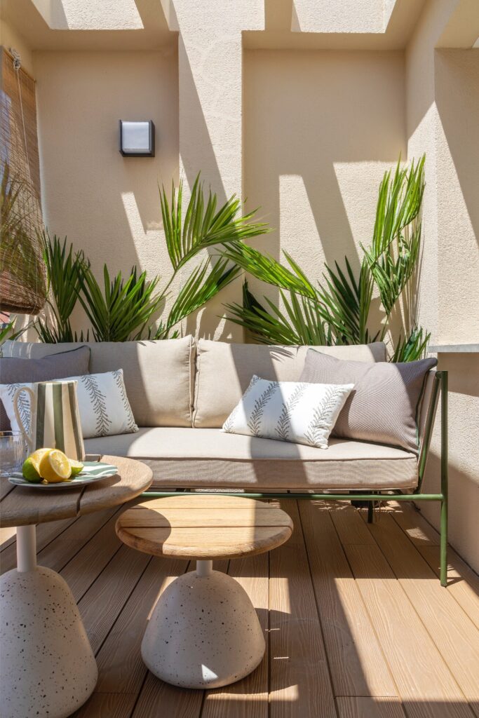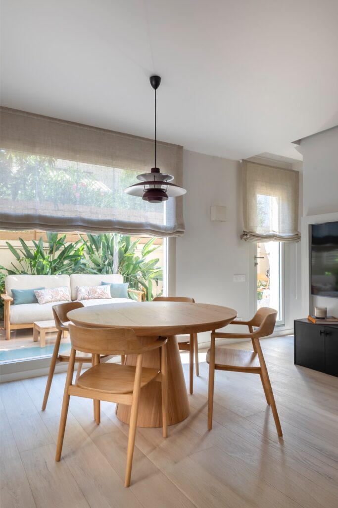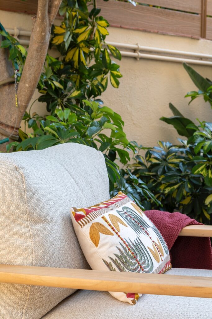 O terraço principal, no rés do chão, é um dos maiores triunfos do projeto. Depois de nivelar as diferentes alturas originais, optou-se por uma pavimentação contínua, que traz coerência e ordem. O espaço, concebido como extensão natural da sala interior, inclui uma grande mesa de jantar da Kave Home, com capacidade para oito pessoas, e uma zona chill out ideal para conviver e relaxar. As ripas do pavimento e da vedação perimetral unificam a estética. Os têxteis da Borondo, com os seus padrões originais, harmonizam-se com os acessórios decorativos e com a vegetação cuidadosamente escolhida.