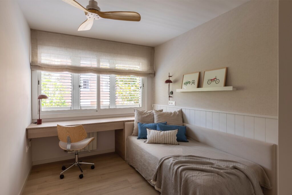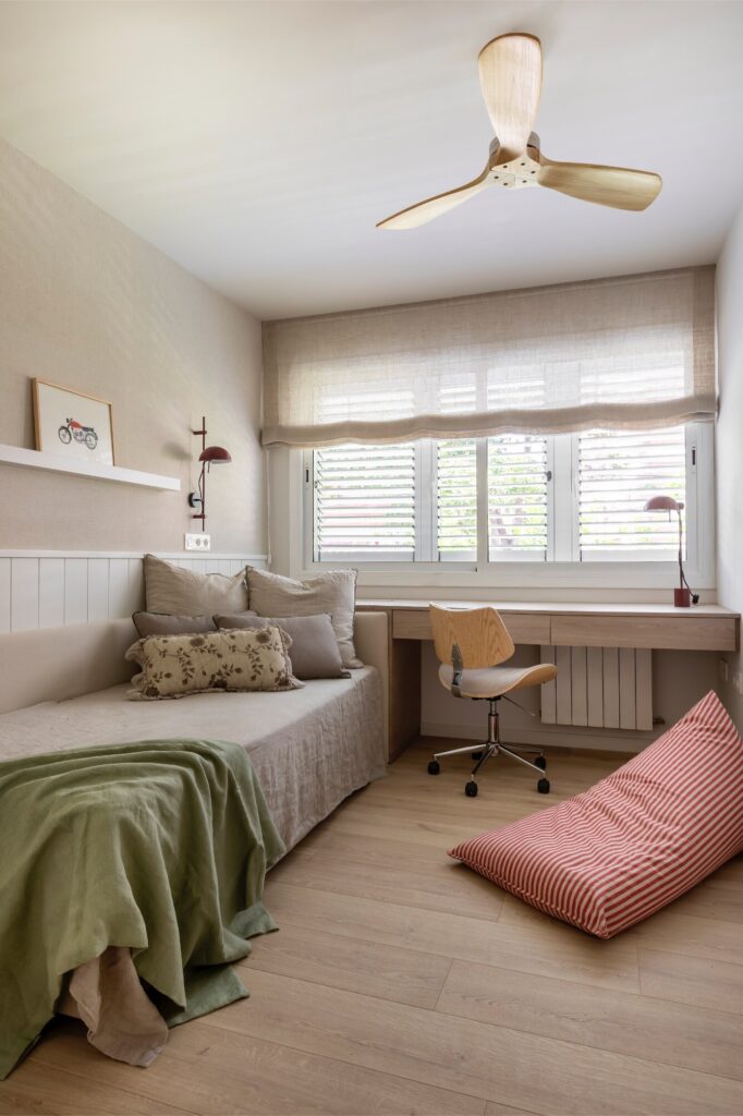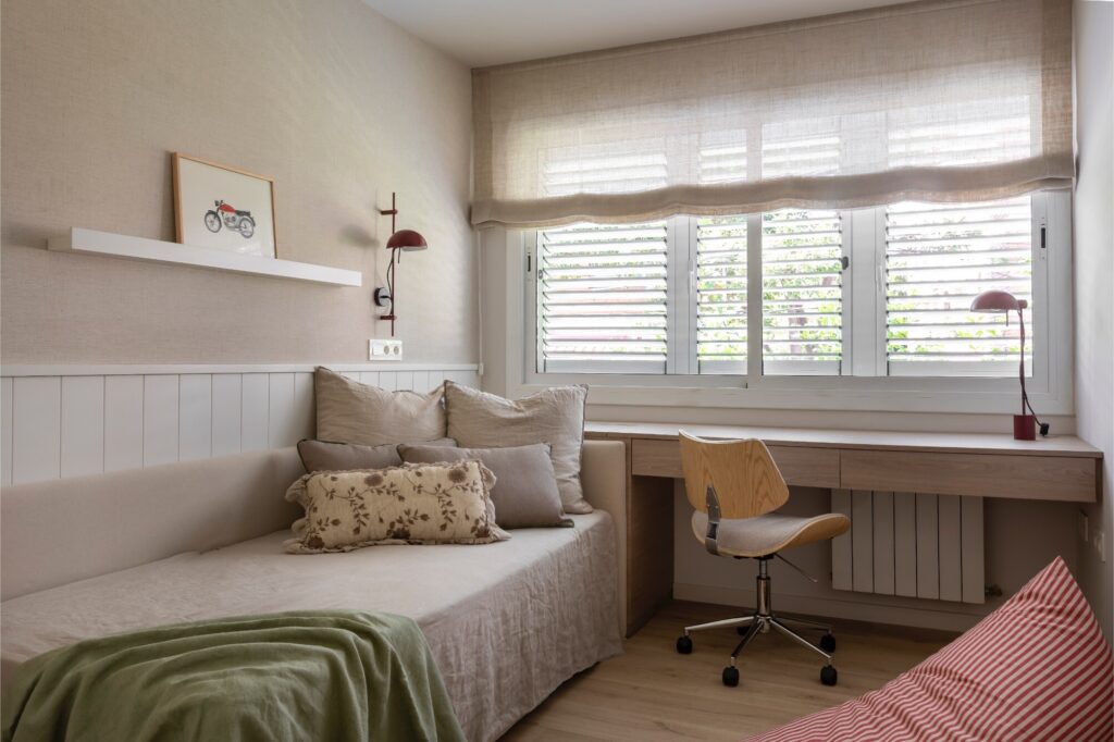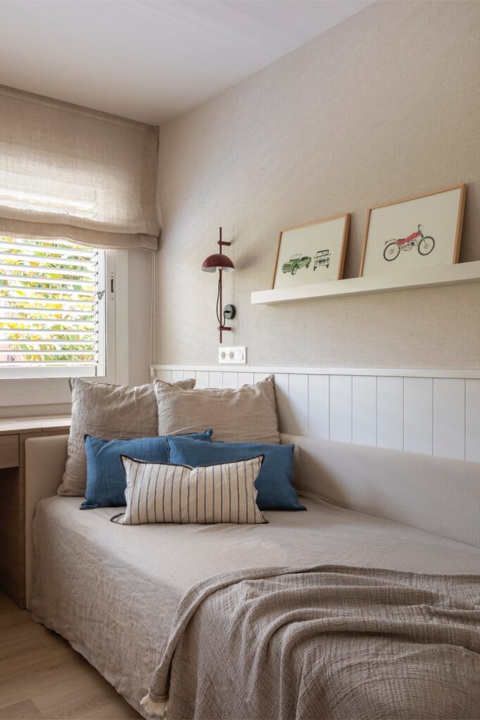 A cabeceira em forma de L confere aconchego e envolvência, enquanto a secretária suspensa com gavetas ocultas contribui para manter a sensação de leveza, unidade e amplitude. As paredes são revestidas com papel pintado de textura têxtil, complementado por um roupeiro lacado no mesmo tom. Destacam-se os quadros coloridos e divertidos da artista Marina Milá, bem como os apliques e o candeeiro de teto da Faro em tom ferrugem, que contrastam com a neutralidade das paredes, estores, almofadas e restantes têxteis.