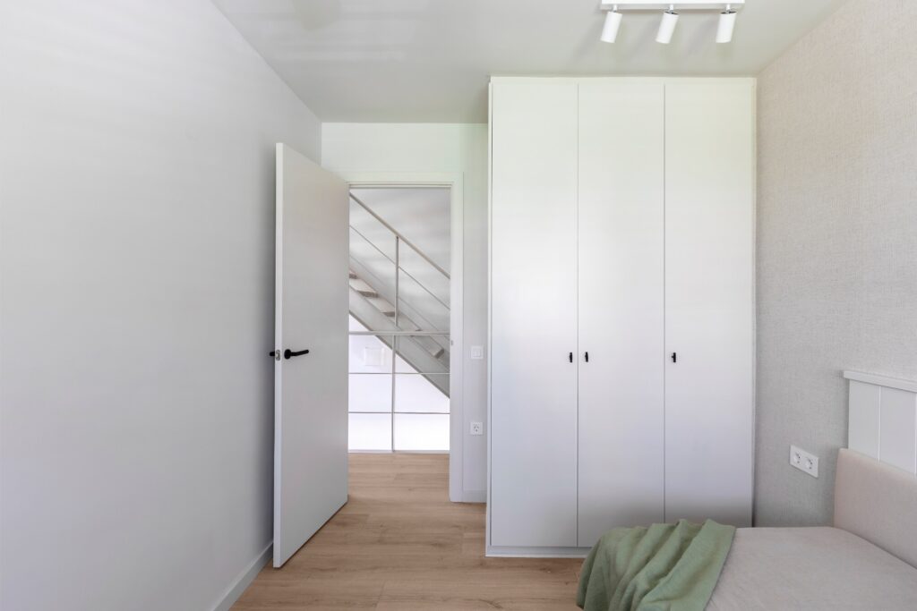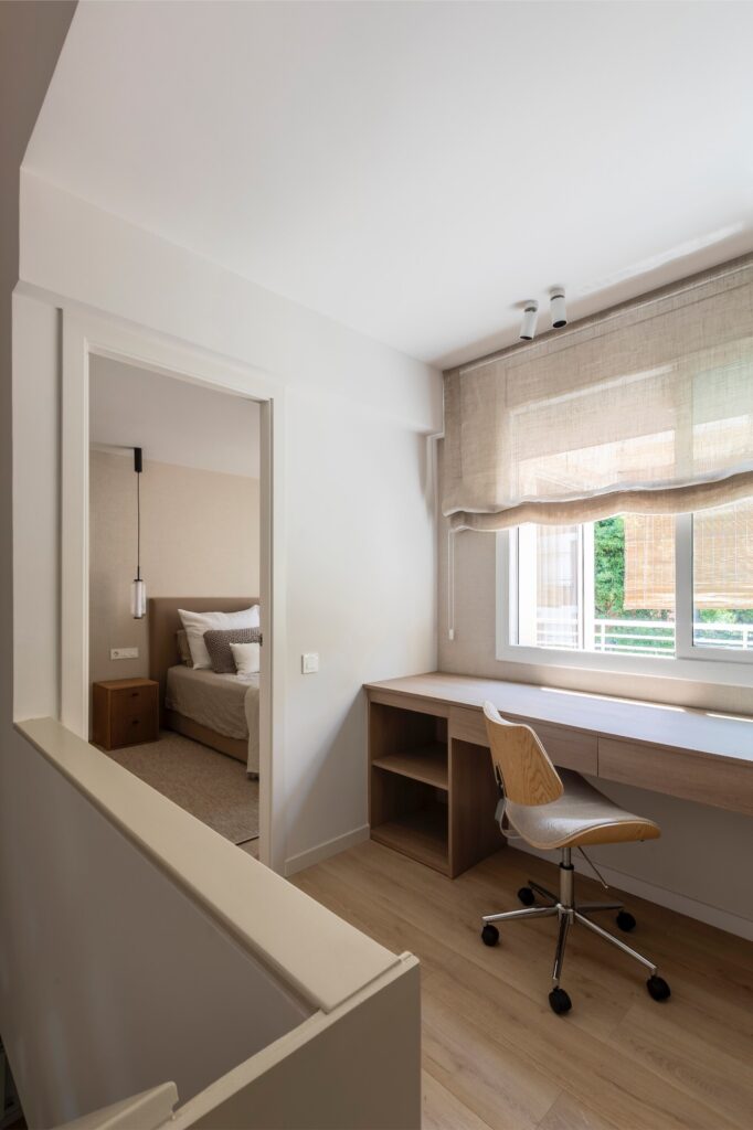 No primeiro andar, encontram-se dois quartos gémeos, desenhados à medida — desde a cama e cabeceira até à secretária. Em ambos, privilegia-se a organização, a limpeza visual e o aproveitamento máximo do espaço, sem abdicar do caráter próprio de cada divisão.