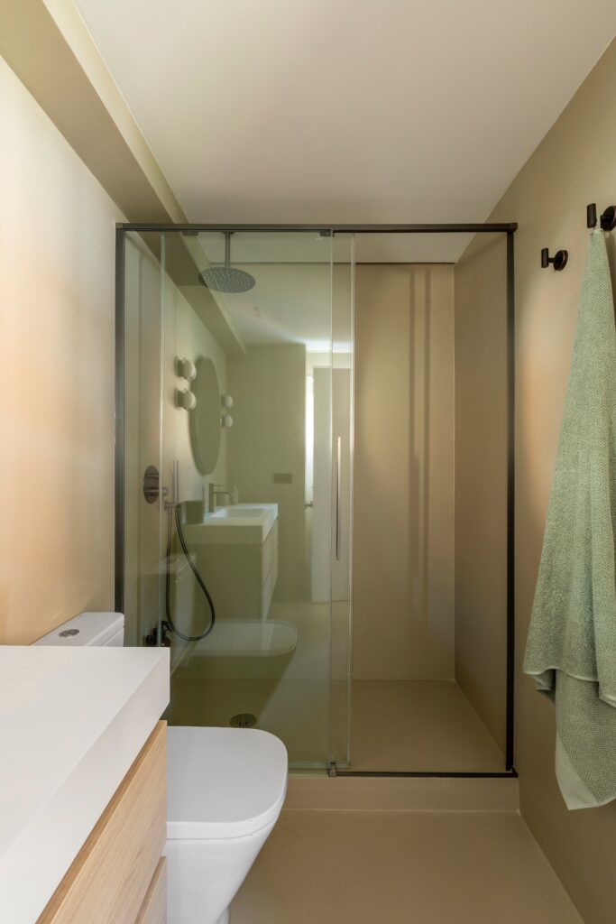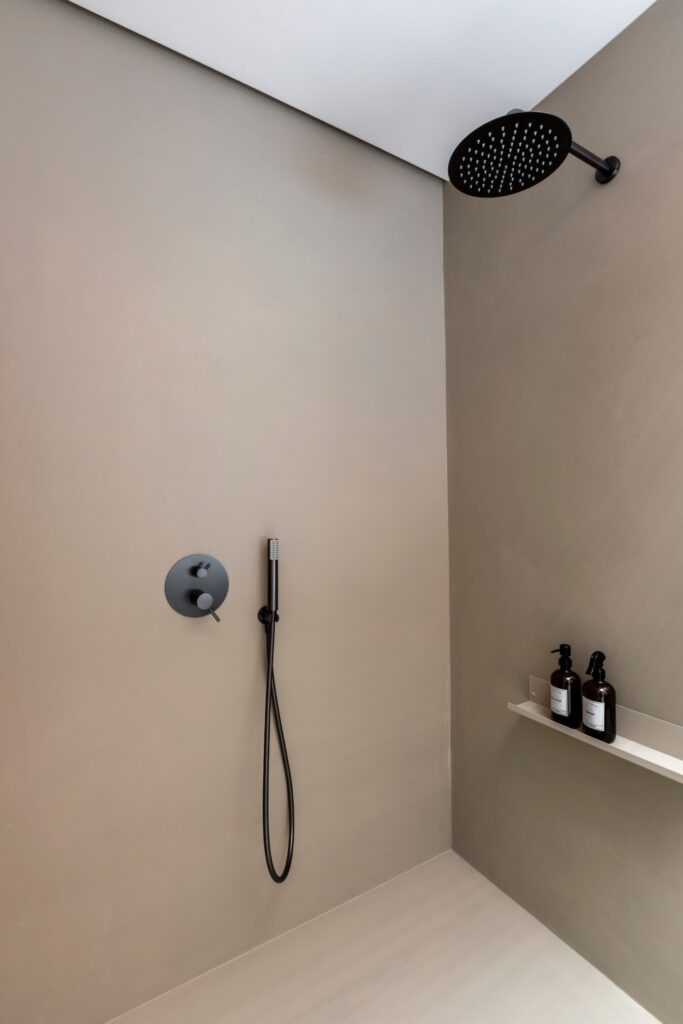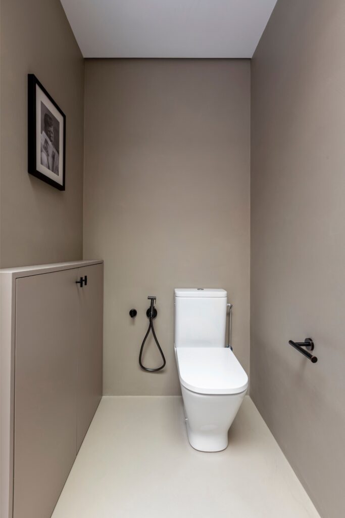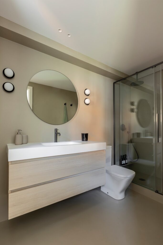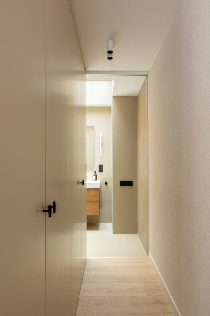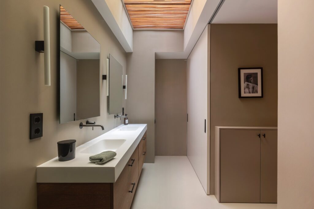 O percurso continua por um closet com armários lacados, que conduz à casa de banho principal: um amplo espaço revestido a microcimento, tanto nas paredes como no chão, banhado por luz natural proveniente de uma claraboia com ripas de madeira de teca, que filtra uma agradável luz zenital. Cada elemento foi pensado ao detalhe, para que entrar neste espaço seja uma experiência única e sensorial, tanto ao começar como ao terminar o dia.