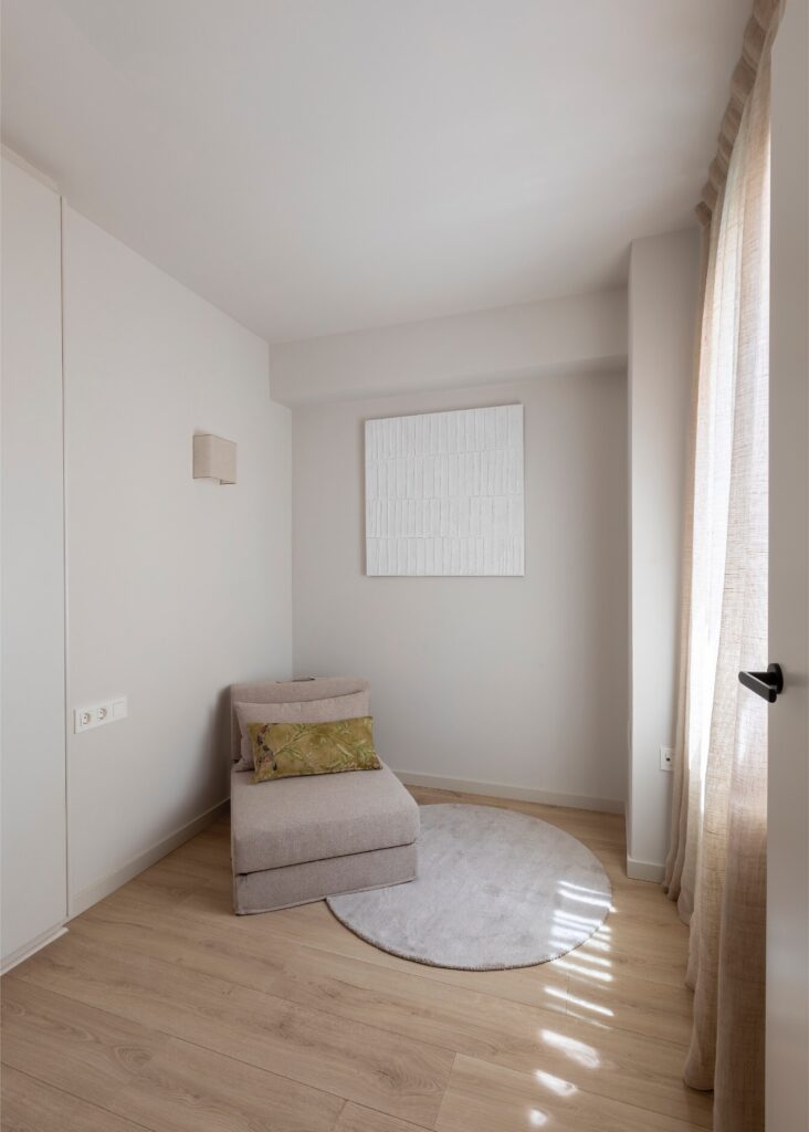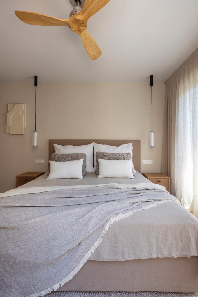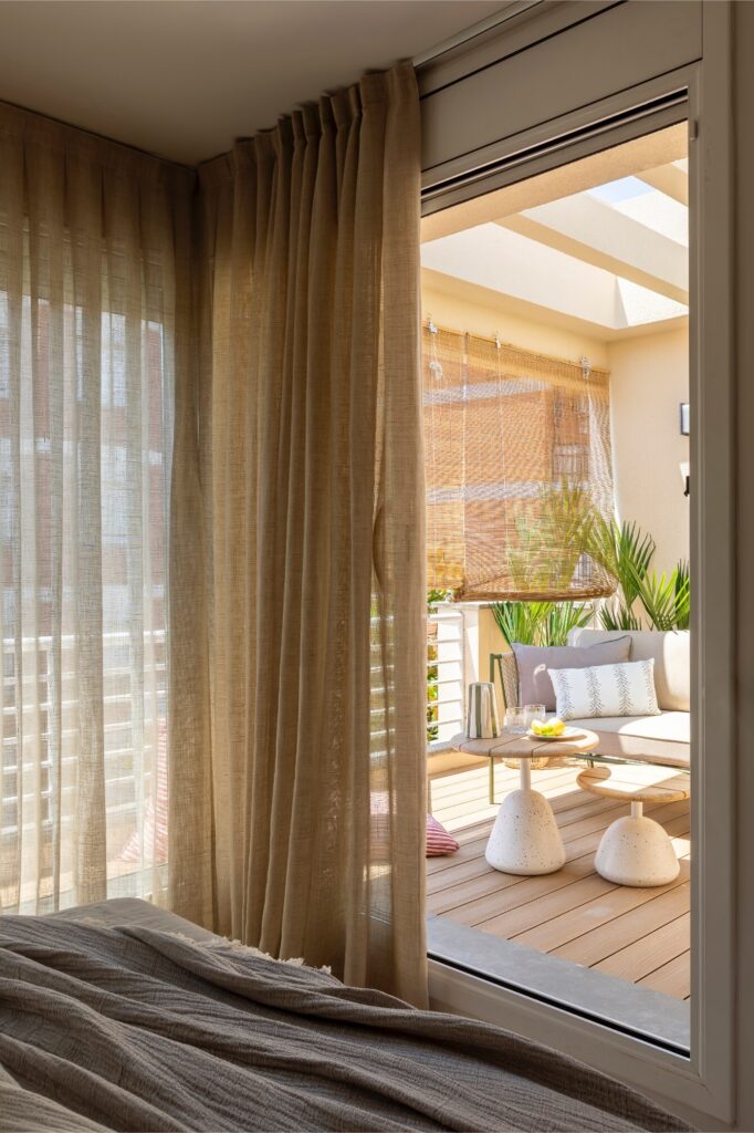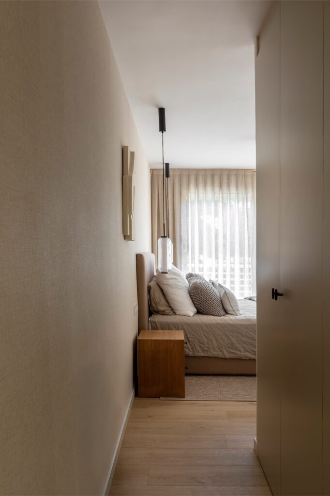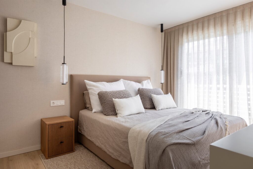 No quarto, uma ampla cama com cabeceira têxtil sobre estrutura de madeira domina o espaço, acompanhada por mesas de cabeceira e candeeiros suspensos da Aromas del Campo, que criam contraste. O papel de parede de textura têxtil, em perfeita sintonia com as cortinas da Ribes i Casals, filtra a luz do grande vão envidraçado, que se abre para um terraço chill out, concebido como extensão natural do quarto e ideal para relaxar.