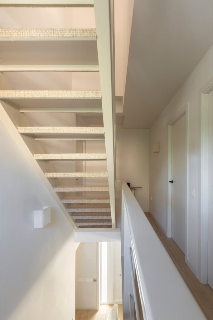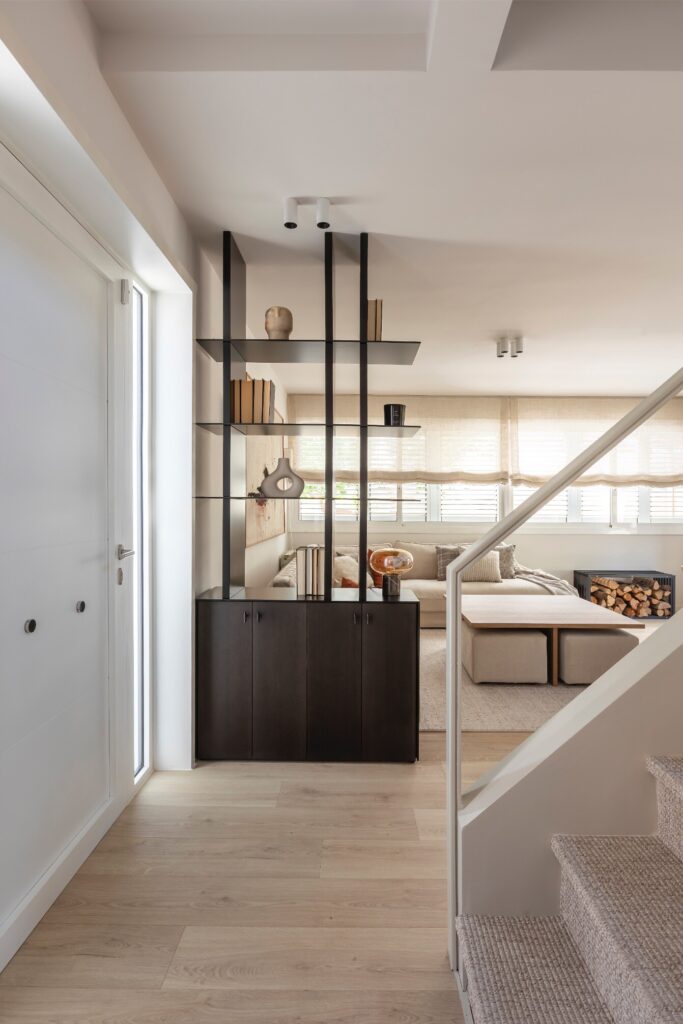 Logo à entrada, uma estante em ferro preto feita à medida, marca distintiva do estúdio Trestrazos, dá as boas-vindas e delimita subtilmente o acesso principal, conduzindo o percurso e proporcionando privacidade à sala de estar. Desta forma, o espaço mantém a sua intimidade, sem renunciar à amplitude e luminosidade natural. Neste piso, três ambientes — sala, sala de jantar e cozinha — fundem-se num só espaço, visualmente conectados, mas com limites estéticos bem definidos. A escada, elemento estrutural e de design, atua como peça central, permitindo que a cozinha permaneça aberta, mas discretamente independente. Aqui, uma alcatifa neutra de fibras naturais cobre os degraus e funde-se com as cortinas, conferindo grande coesão visual ao conjunto.