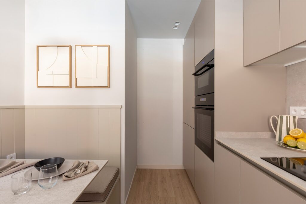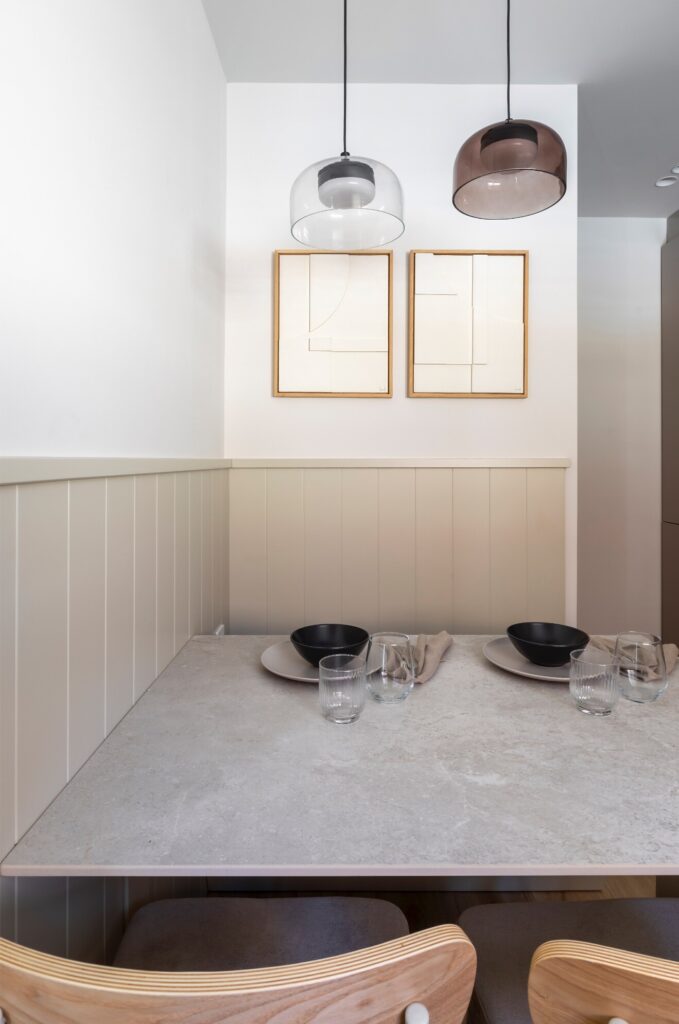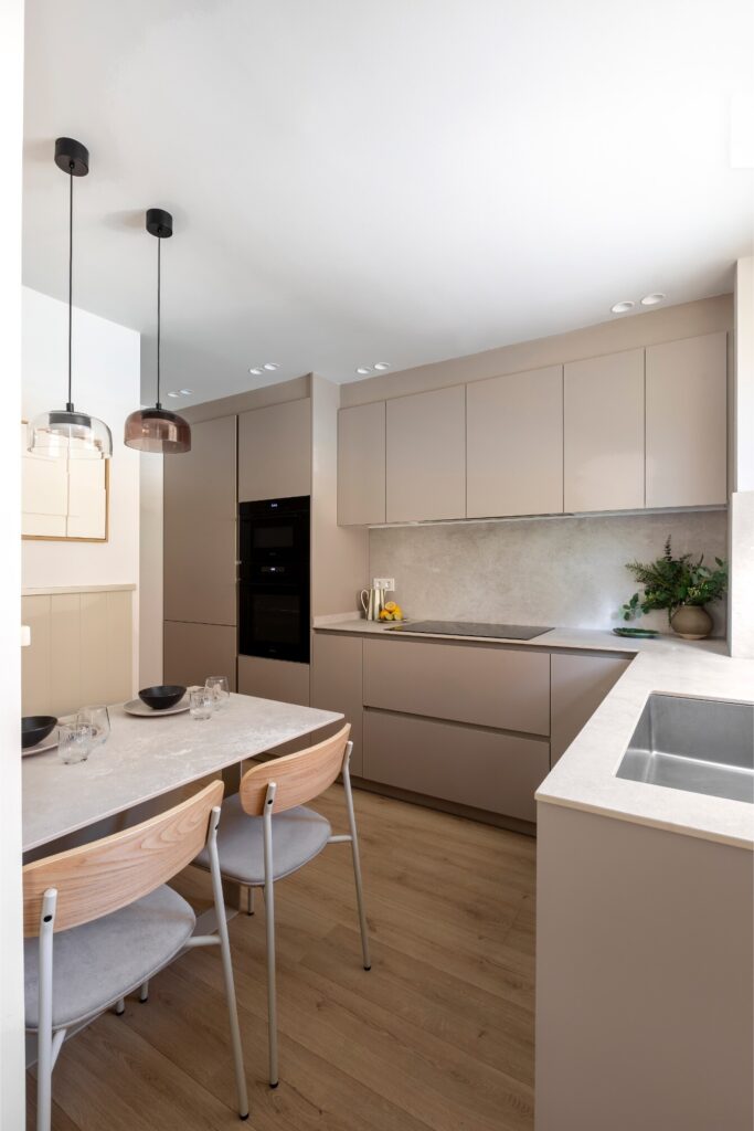 A cozinha, em tons neutros, conta com uma bancada texturada da Laminam, mesa de refeição no mesmo material e um banco lacado da mesma cor que os móveis, otimizando o espaço e reduzindo o ruído visual. Com os eletrodomésticos integrados, obtém-se uma estética limpa e contemporânea, acentuada pelos candeeiros suspensos em diferentes tons da Aromas del Campo e por um par de quadros de Hiwood.