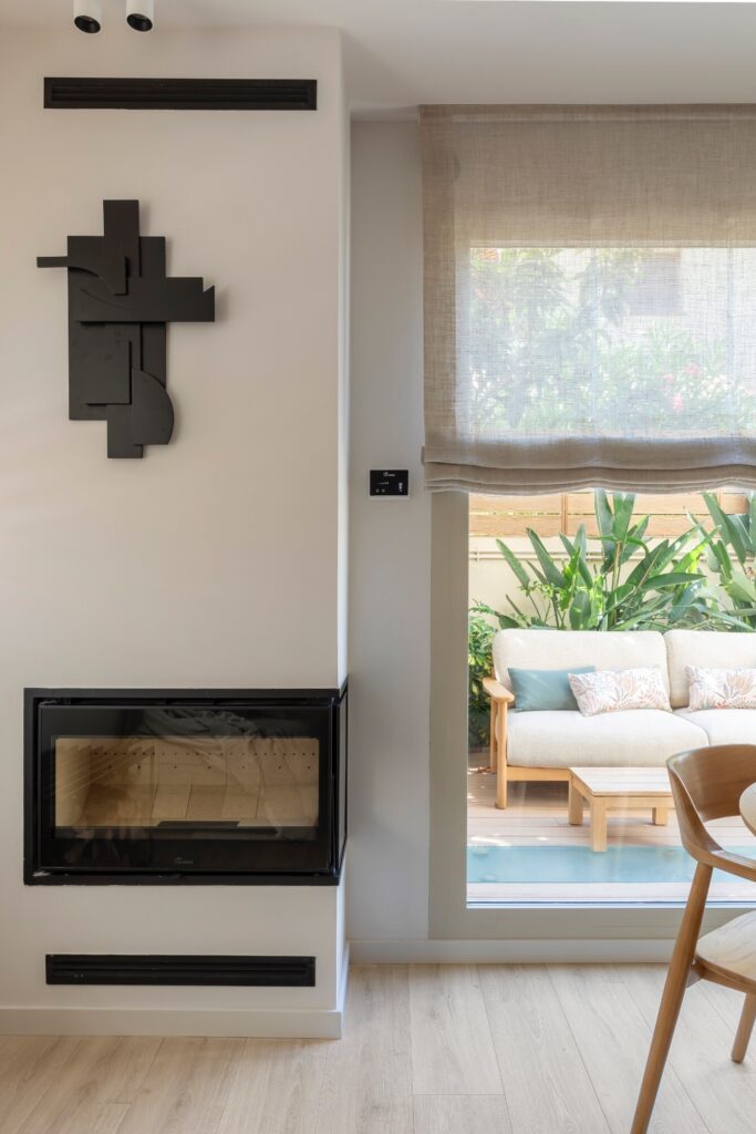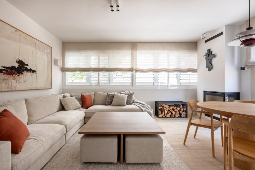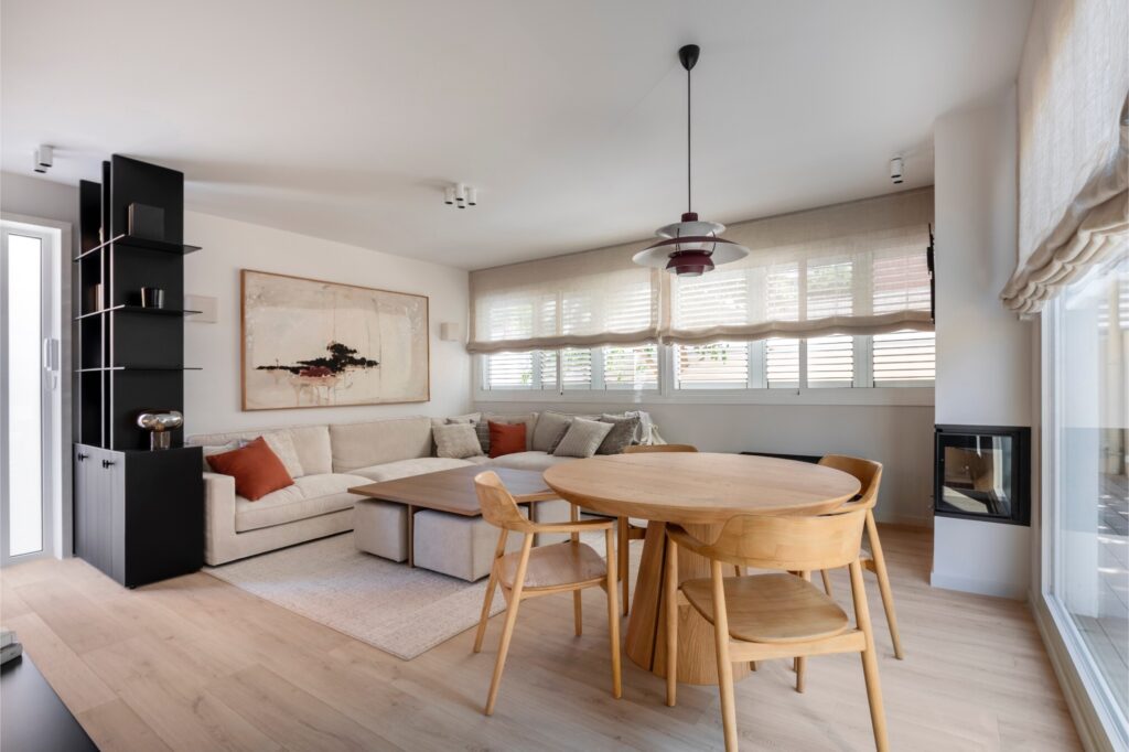 Na sala, destaca-se uma lareira embutida num pilar de canto, que se converte num elemento escultórico de forte presença estética. Predominam os tons de pedra, a madeira e o preto. Um sofá em L feito à medida é acompanhado por uma mesa de centro em madeira desenhada para este espaço, com pufes integrados que ampliam o assento quando necessário. O conjunto completa-se com uma mesa auxiliar em madeira com quatro cadeiras, um móvel baixo em ferro e carvalho feito à medida, que emoldura a televisão e a integra na parede da escada, e um candeeiro suspenso icónico de Louis Poulsen.