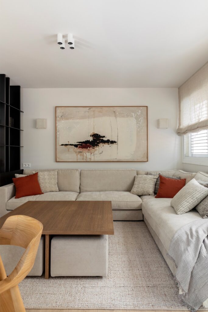 A madeira, o ferro, os lacados e os têxteis naturais dão corpo a este projeto, dominado por tons de pedra, neutros e cinzentos, complementados por toques em cor de ferrugem, borgonha e preto, presentes em almofadas, candeeiros ou puxadores. Um dos elementos-chave da intervenção é a escada central, que liga os três pisos e foi repensada tanto do ponto de vista estético como funcional; optou-se por forrá-la a tecido para a integrar no conjunto e por lacar a estrutura metálica num tom em harmonia com as cores-base da casa.