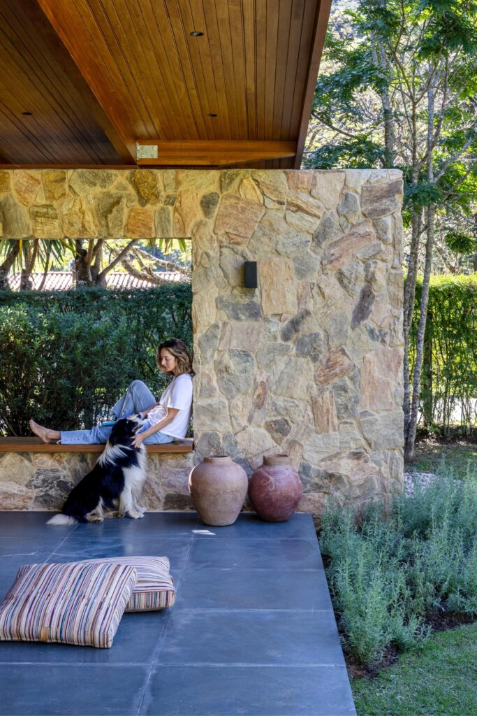 A integração entre interior e exterior foi outro fator fundamental no projeto. O pavimento em ardósia natural, nas varandas e no interior, cria uma continuidade visual e tátil, reforçando o caráter fluido dos espaços. Na lateral, um muro de pedra bruta e madeira protege a varanda da rua sem bloquear a vista.