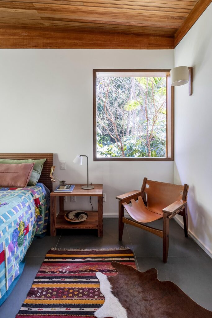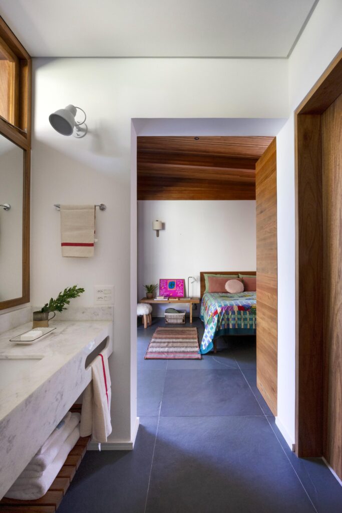 Na decoração, prevalece a simplicidade: camas e mesinhas do Ateliê Fernando Jaeger combinam linhas neutras e materiais honestos, enquanto tapetes, quadros e objetos vêm do acervo afetivo da família, reforçando a atmosfera de casa vivida. Nas casas de banho, a serenidade continua com mármore branco nacional e pastilhas de 5×5 cm, num diálogo entre tradição e frescura.