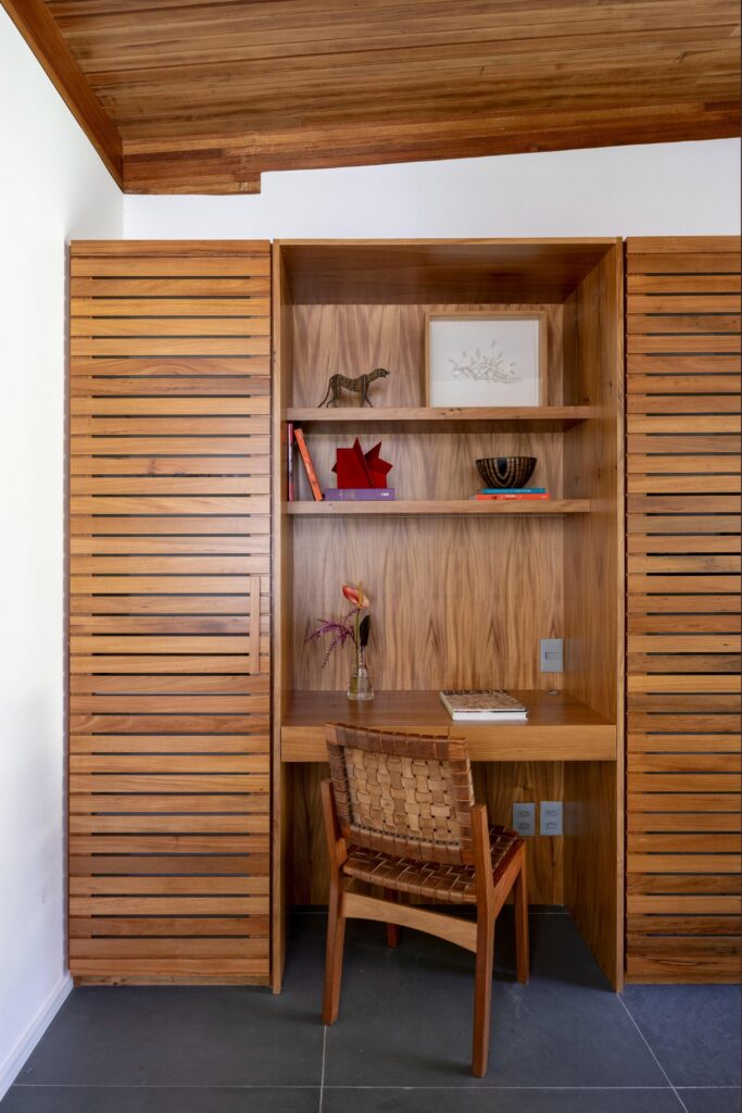“Eles queriam mais espaço para receber os filhos, noras e cinco netos, e também sonhavam com um teto forrado em madeira de demolição”, conta Fabiana. O desejo foi o ponto de partida para o ambiente da casa.