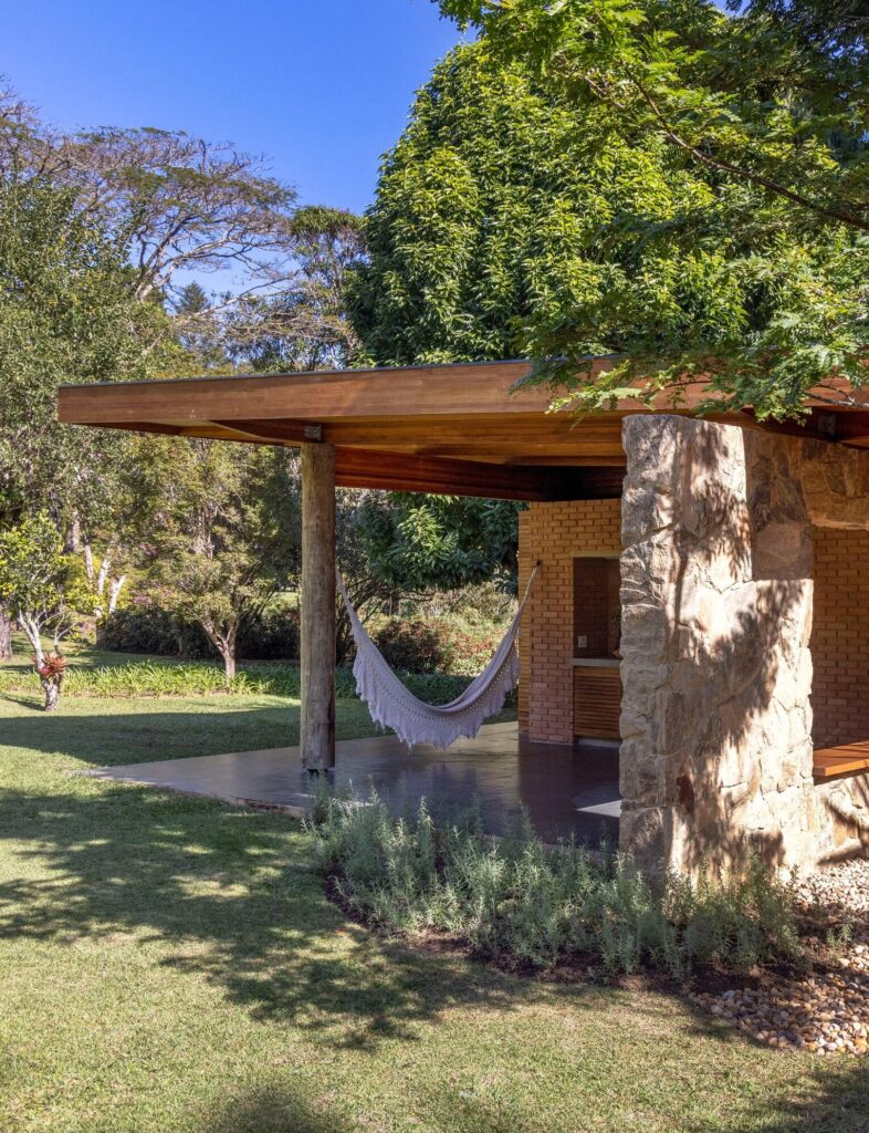 Enquanto a casa principal se destaca pelos tijolos pintados de branco, a nova construção aposta no tijolo aparente em tom terracota, criando uma harmonia visual entre o novo e o antigo. O telhado em vigas de madeira laminada colada (MLC) — material de reflorestamento com origem certificada — garante leveza, eficiência e um toque rústico, perfeito para o cenário de campo. “Depois da base concluída, toda a montagem da cobertura, incluindo as telhas metálicas, foi feita em apenas duas semanas”, explica Fabiana. “E, como o terreno tem um leve declive, elevámos o piso para evitar a humidade típica da serra”, acrescenta Ana Paula.