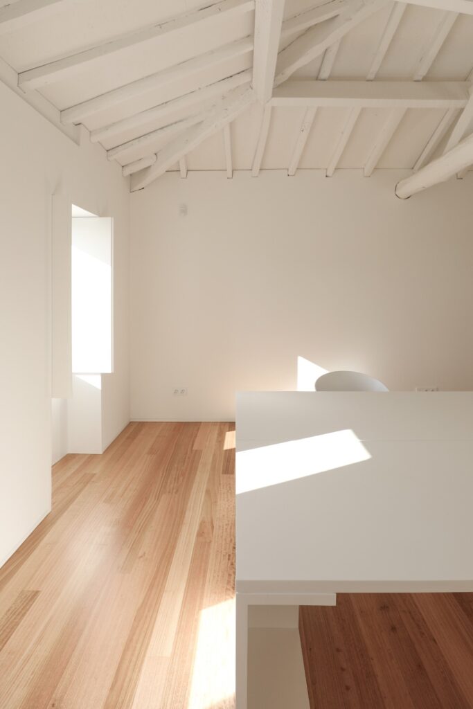 Da construção existente preservou-se a estrutura de madeira do telhado, que se deixou à vista para possibilitar aumentar a altura interior dos espaços. Na área da antiga cozinha, permaneceram o forno, a chaminé aberta de fogo de lenha, as paredes em granito e o tabique à vista. Na sala principal com duas mesas grandes de trabalho, o pavimento é em soalho de madeira e as janelas mais pequenas com as portadas permitem controlar a iluminação natural. Apenas este espaço funciona como segundo piso, os restantes espaços são térreos à cota do jardim posterior, e nesses o pavimento é em mármore branco.