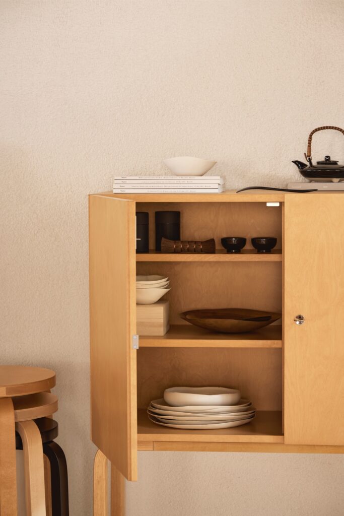 Conhecido como “móvel de bar”, o Cabinet 250 regressa à coleção Artek após o sucesso da edição limitada lançada no início de 2025, como parte da colaboração Artek + Moomin. Simples na forma e festivo na função, é uma peça central para salas de estar e de jantar, ideal para guardar louças especiais ou bebidas. Embora o Cabinet 250 seja creditado a Alvar Aalto pelo uso da perna em L, documentos de arquivo mostram que Aino Aalto foi a primeira a unir um corpo de armário à perna em L. Compacto e bem proporcionado, também é prático para armazenar roupa de cama ou vestuário, refletindo a crença de Aino de que nenhum objeto ou função é indigno de beleza estética.