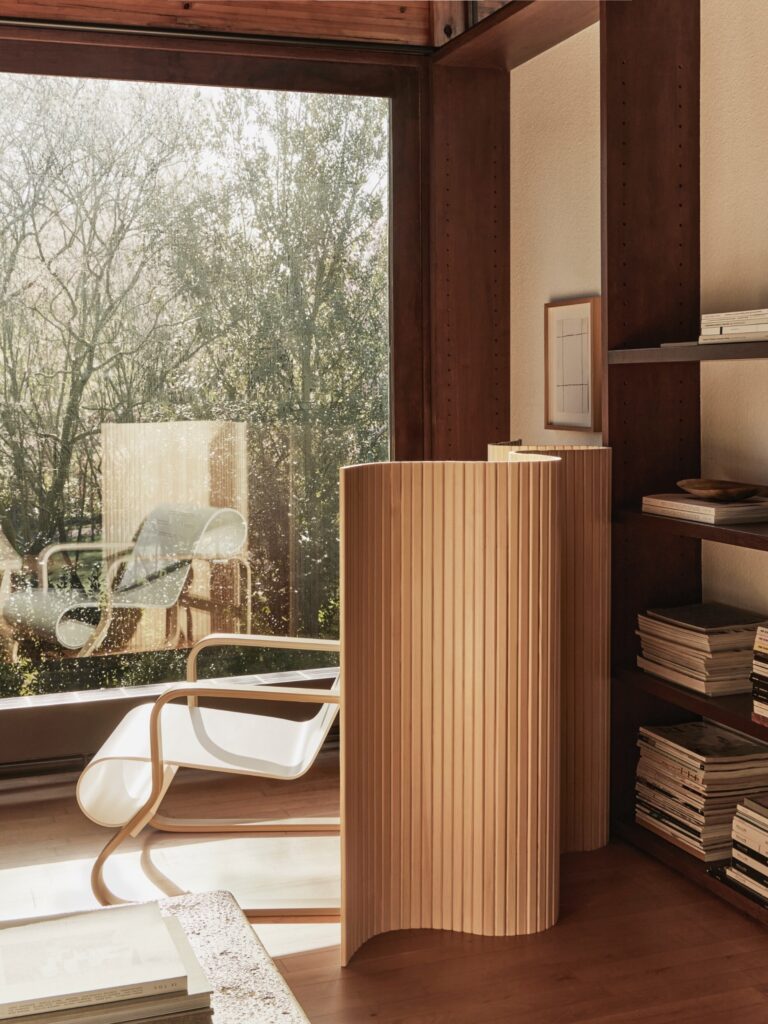 O Screen 100 é o design mais arquitetónico de Alvar Aalto: um biombo com uma forma ondulante suave que evoca o padrão orgânico das ondas presente em muitos edifícios do arquiteto. Agora disponível em quatro alturas — 100 cm, 130 cm, 150 cm e 180 cm — adapta-se às necessidades variadas dos interiores contemporâneos. Além de dividir espaços, pode ocultar áreas, criar um fundo acolhedor para diferentes tipos de assentos, servir como cabide informal ou até como um elegante fundo para videochamadas. Leve e bem proporcionado, pode ser enrolado para armazenamento e moldado conforme o espaço. É fabricado em pinho finlandês, uma madeira macia que desenvolve uma pátina elegante com o tempo.