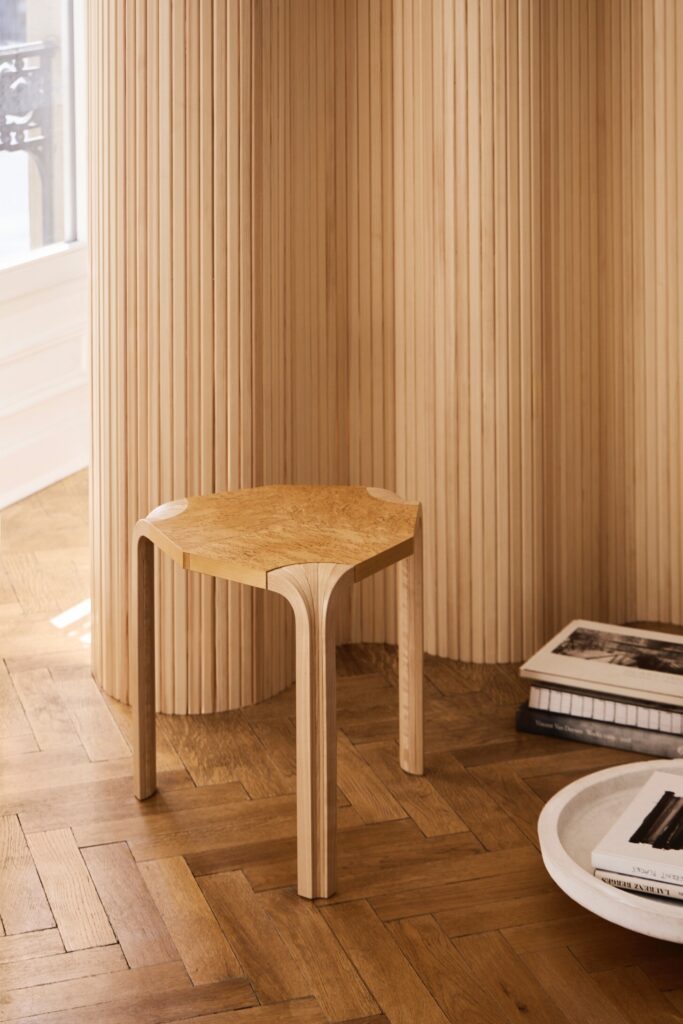 Duas edições especiais e limitadas do Stool X602 celebram os 90 anos da Artek, destacando uma das inovações mais refinadas de Alvar Aalto: a perna em X, em forma de leque. Apresentada pela primeira vez na exposição Konstruktiv Form de 1954, na loja Nordiska Kompaniet, em Estocolmo, a perna em X é uma evolução escultórica da icónica perna em L de Aalto. O assento hexagonal do banco apresenta um revestimento em folha de bétula frisada, aplicado através da técnica de marchetaria. A bétula frisada é uma variante rara da bétula-prateada finlandesa, com anéis ondulados e irregulares que formam um padrão flamejante, realçando o apelo estético da peça. O banco está disponível em dois modelos: um totalmente tingido em tom mel; e outro com assento tingido em mel e pernas envernizadas naturais, criando um contraste que evidencia a estrutura da perna em X. Cada modelo é limitado a apenas 90 peças numeradas individualmente, tornando-o uma peça de coleção muito exclusiva.