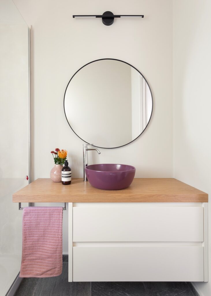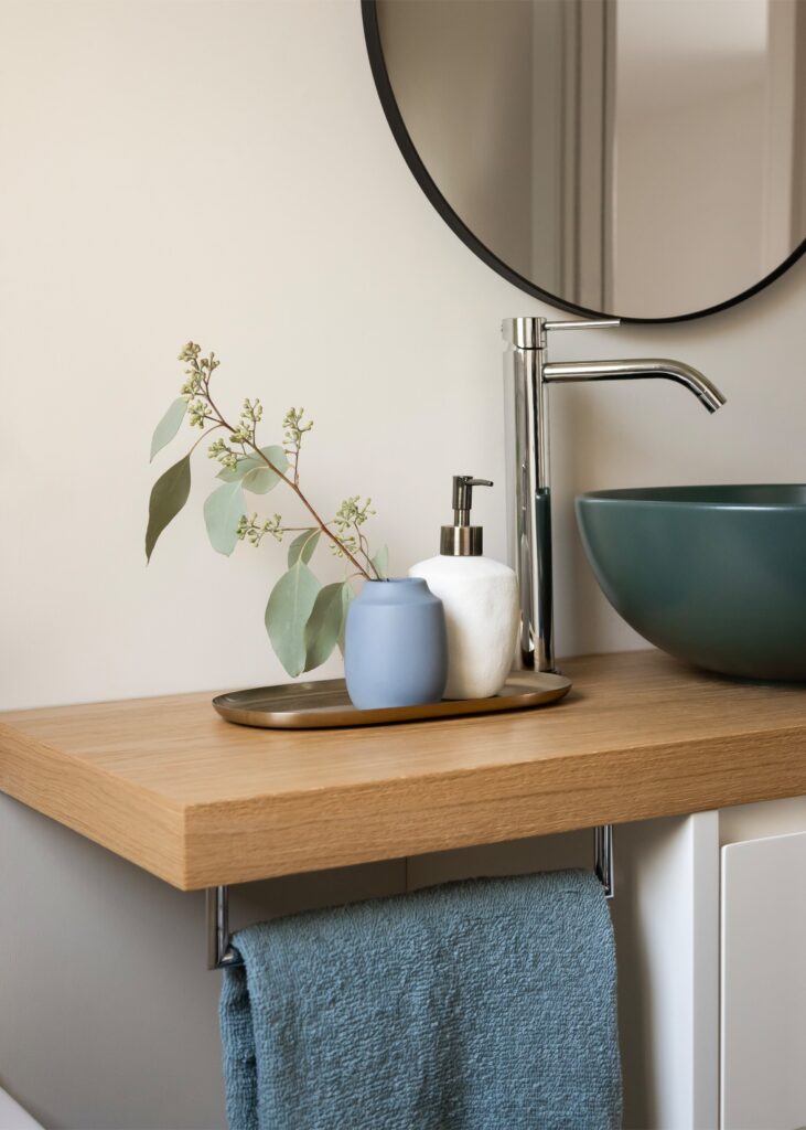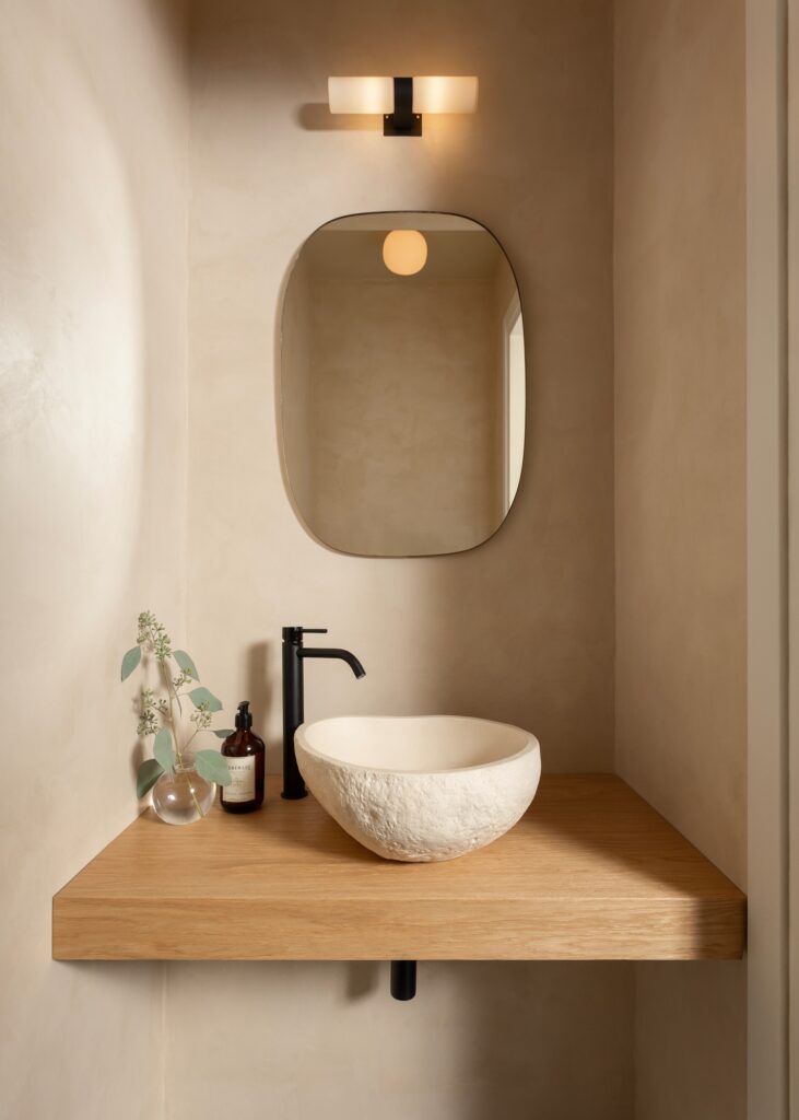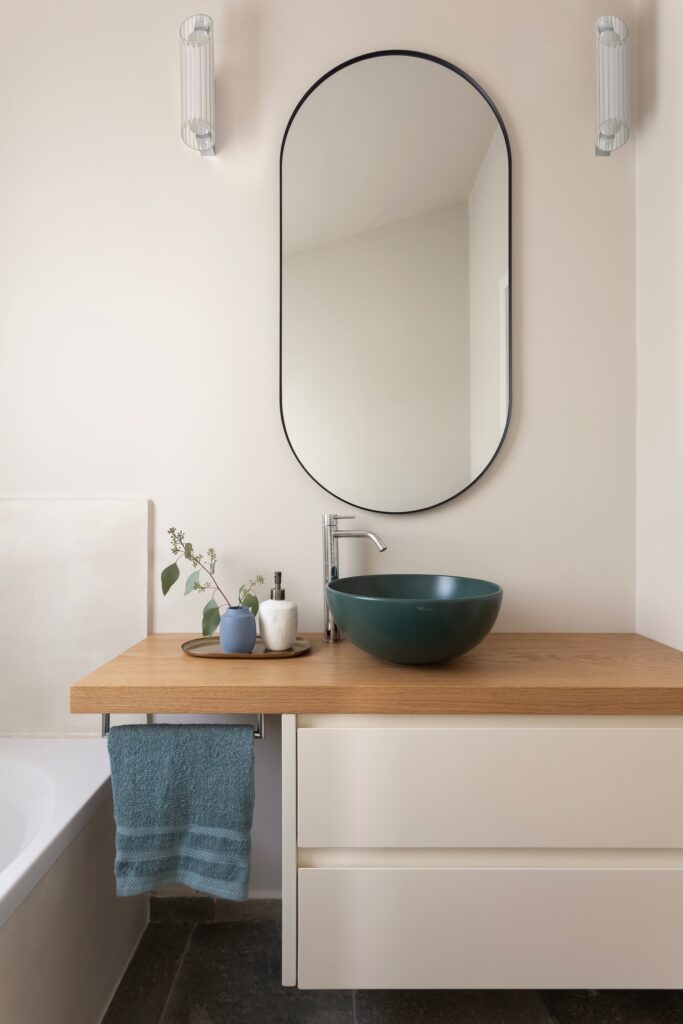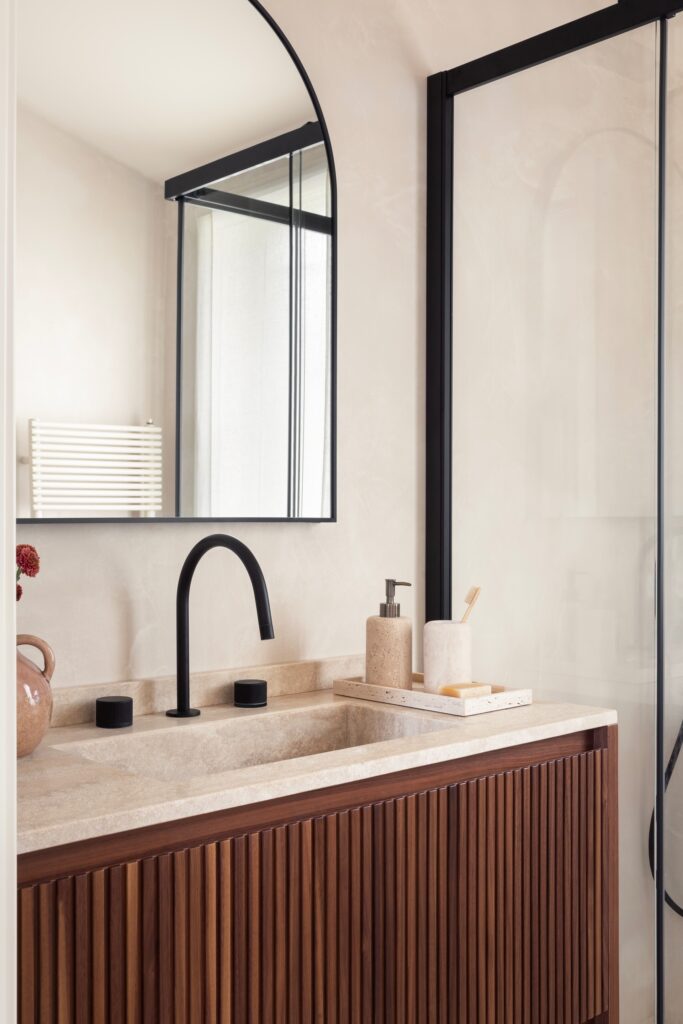 As casas de banho, totalmente redesenhadas, retomam a mesma linguagem material: móveis em madeira canelada, lavatórios esculturais e torneiras em preto mate criam um contraste contemporâneo e sofisticado, coerente com o resto do projeto.
