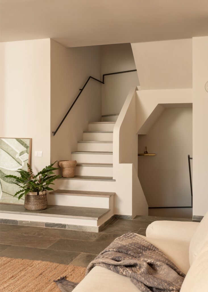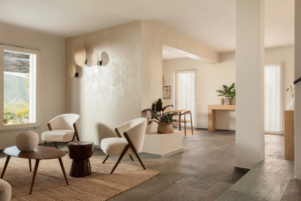 Os acabamentos em tons quentes e neutros estabelecem um diálogo constante com a paisagem: os pavimentos em pedra evocam as cores da costa, as paredes em estuque suave valorizam a luz natural e a madeira traz calor e continuidade.