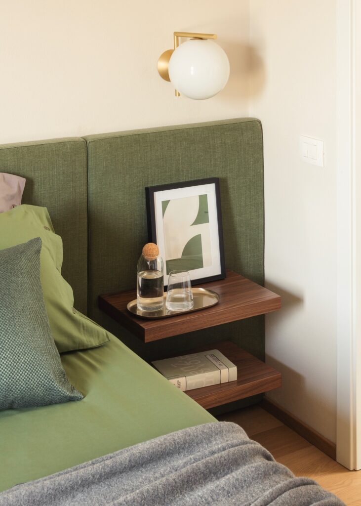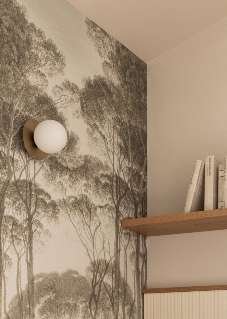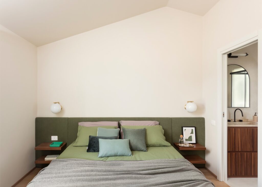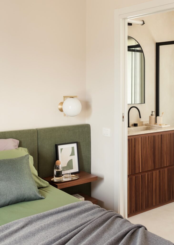 Na zona dos quartos, a paleta torna-se mais profunda e envolvente: tons de verde e cinzento misturam-se com madeira natural e detalhes em latão acetinado, criando um ambiente íntimo e sereno.