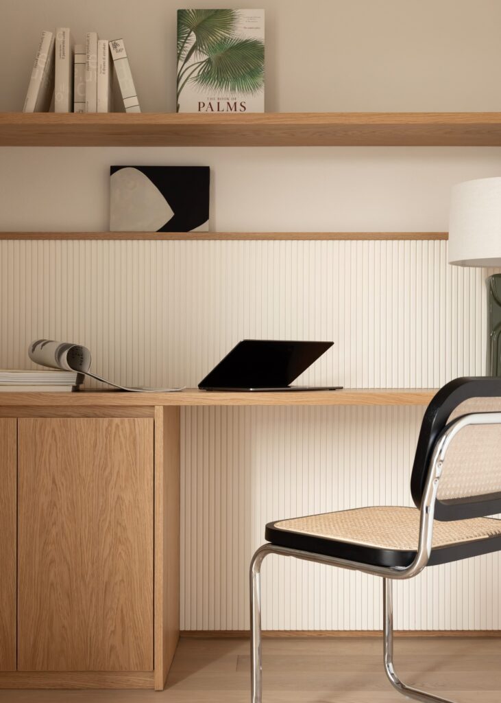 Aqui, o design centra-se em elementos feitos por medida, como cabeceiras e mesas de apoio integradas, que combinam funcionalidade com uma elegância refinada.