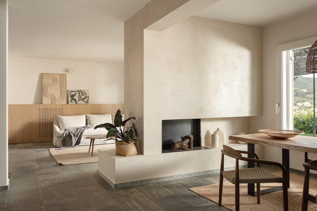 O coletivo Nomade Architettura assina os interiores desta casa à beira-mar, com acabamentos em tons quentes e neutros e uma lareira que é o coração da sala de estar. As fotografias são de Simone Furiosi.