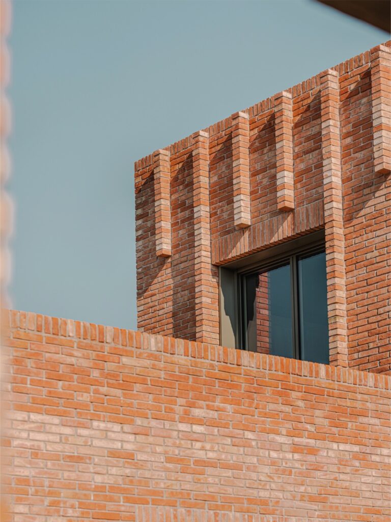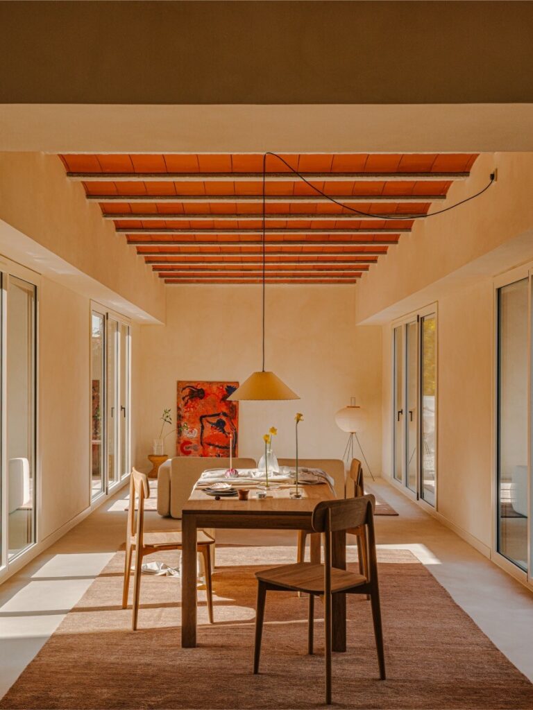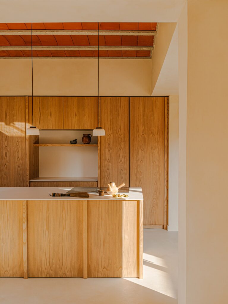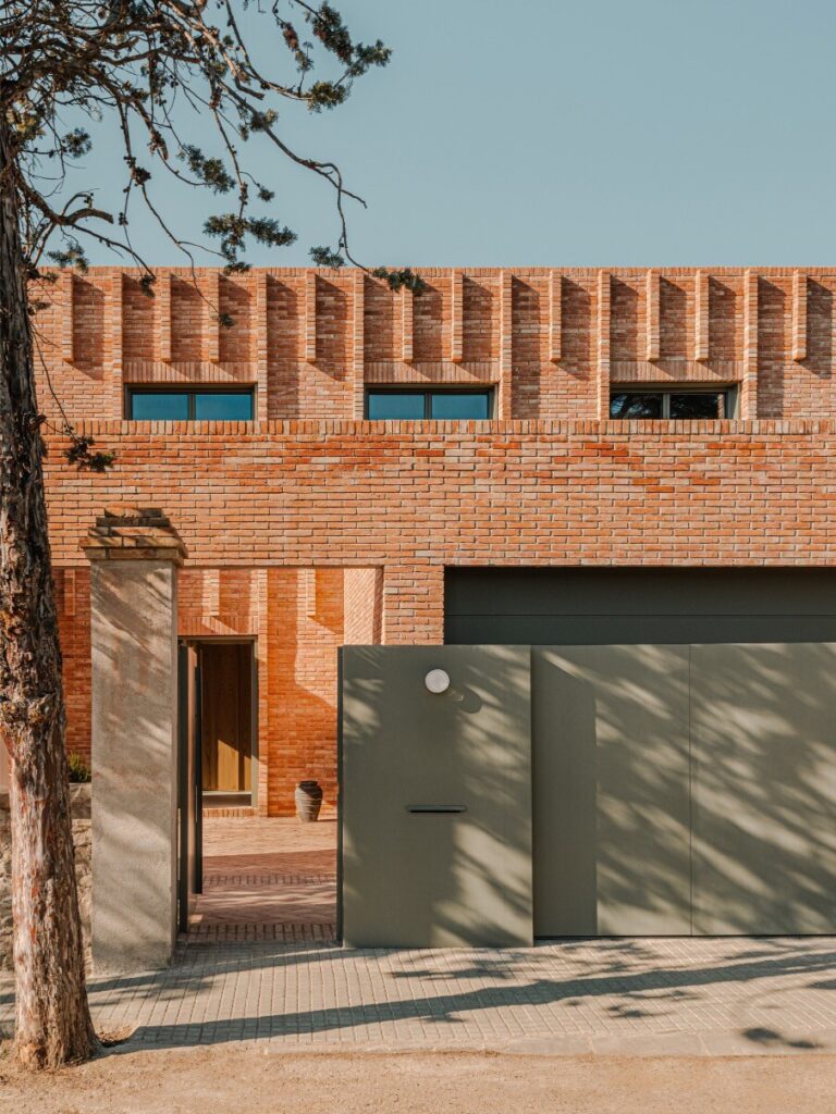 A luz, aliás, é um dos protagonistas do projeto. A casa acompanha o percurso solar ao longo do dia, permitindo que os seus habitantes percebam as mudanças subtis das estações e das sombras. Uma qualidade reforçada pelo uso de materiais destinados a envelhecer com dignidade. Os muros em tijolo manual, fabricado no Forn d’Obra Duran segundo processos artesanais, conferem textura, irregularidade e profundidade visual. Este material estende-se também aos pavimentos exteriores, peitoris e remates, unificando a linguagem construtiva.