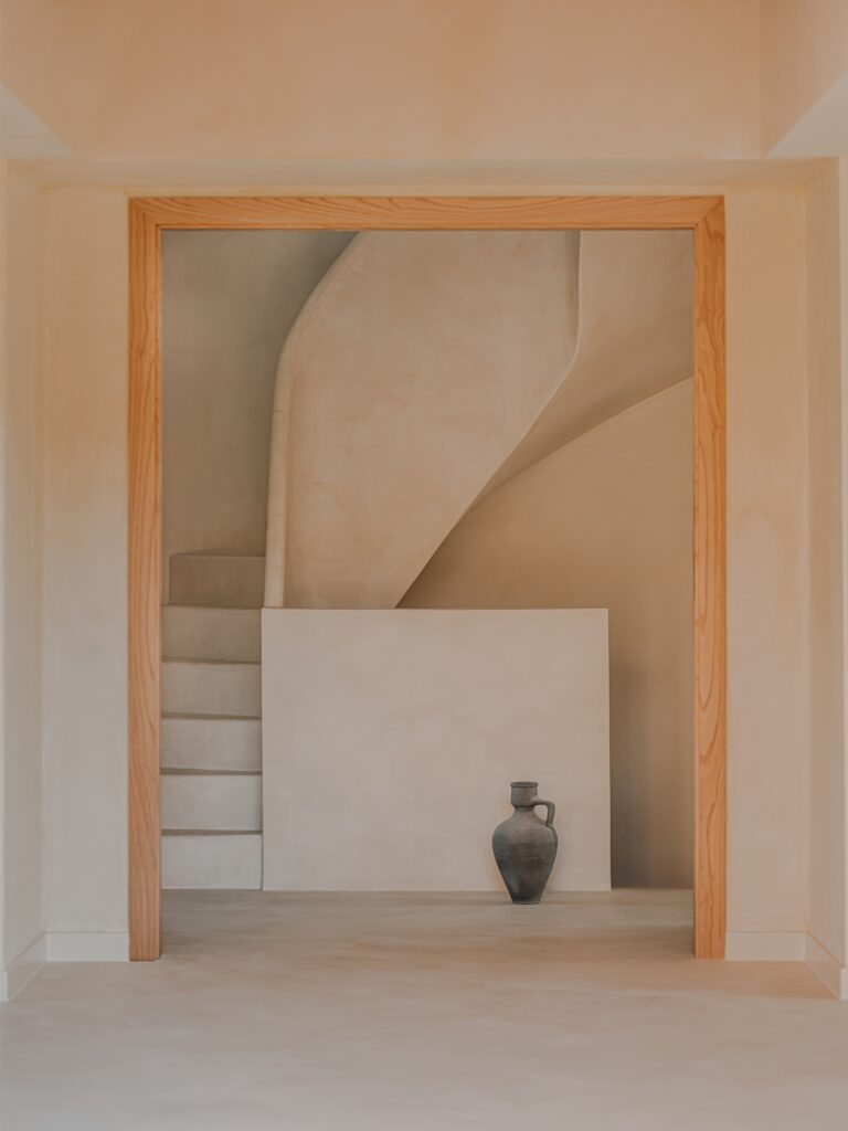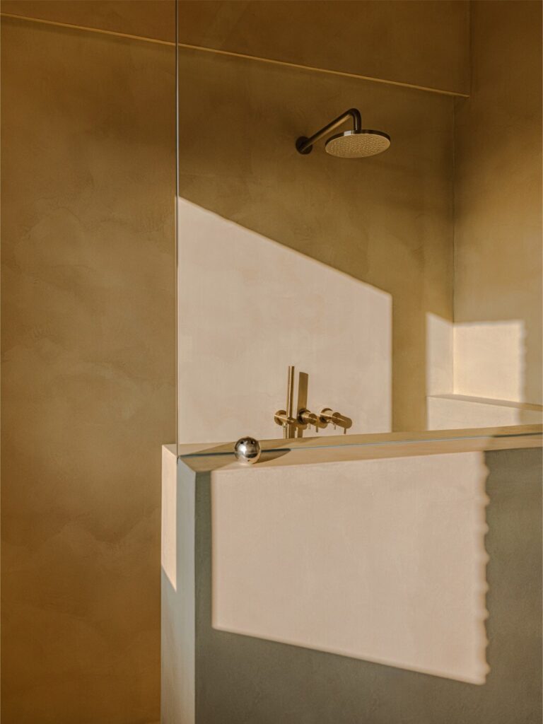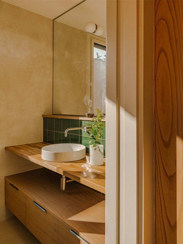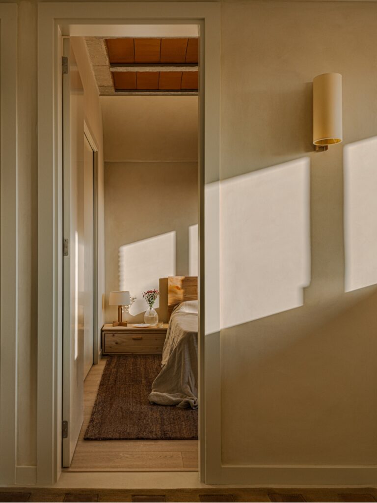 No interior, a paleta mantém-se contida. O microcimento da INGREMIC percorre o piso térreo, enquanto o piso superior recebe soalho natural. As abóbadas cerâmicas expostas revelam a estrutura, e o mobiliário fixo em madeira de castanheiro reforça a ideia de honestidade material. Nas casas de banho, o microcimento dialoga com os azulejos vidrados da Ceràmica Ferrés, criando uma atmosfera contida, mas luminosa.