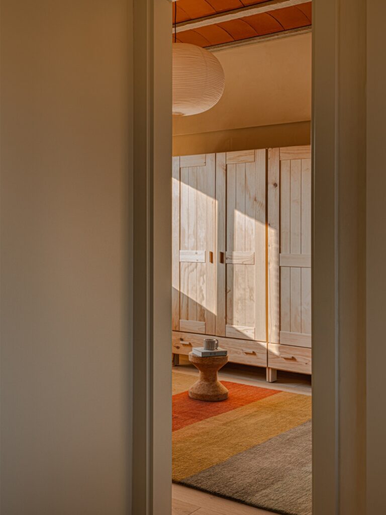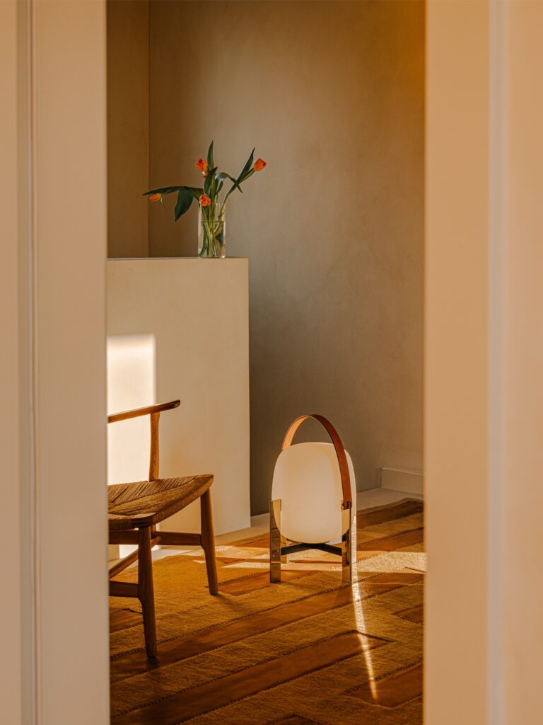 A seleção de peças soltas segue o mesmo princípio de sobriedade funcional. Na sala de estar convivem o candeeiro Akari da Vitra, um banco de cortiça Cork Family de Jasper Morrison e um vaso de vidro de Alvar Aalto. A sala de jantar articula a mesa e cadeiras da Tikamoon com a suspensão Sísí de Santa & Cole e um tapete da DAC Rugs. A cozinha feita à medida em castanheiro é iluminada pelas HeadHat Bowl, também da Santa & Cole. No piso superior, a área de circulação ganha vida com uma poltrona Carl Hansen, a icónica Cesta Metálica e os apliques TMM da mesma marca, acompanhados por um tapete de The Rug Company.