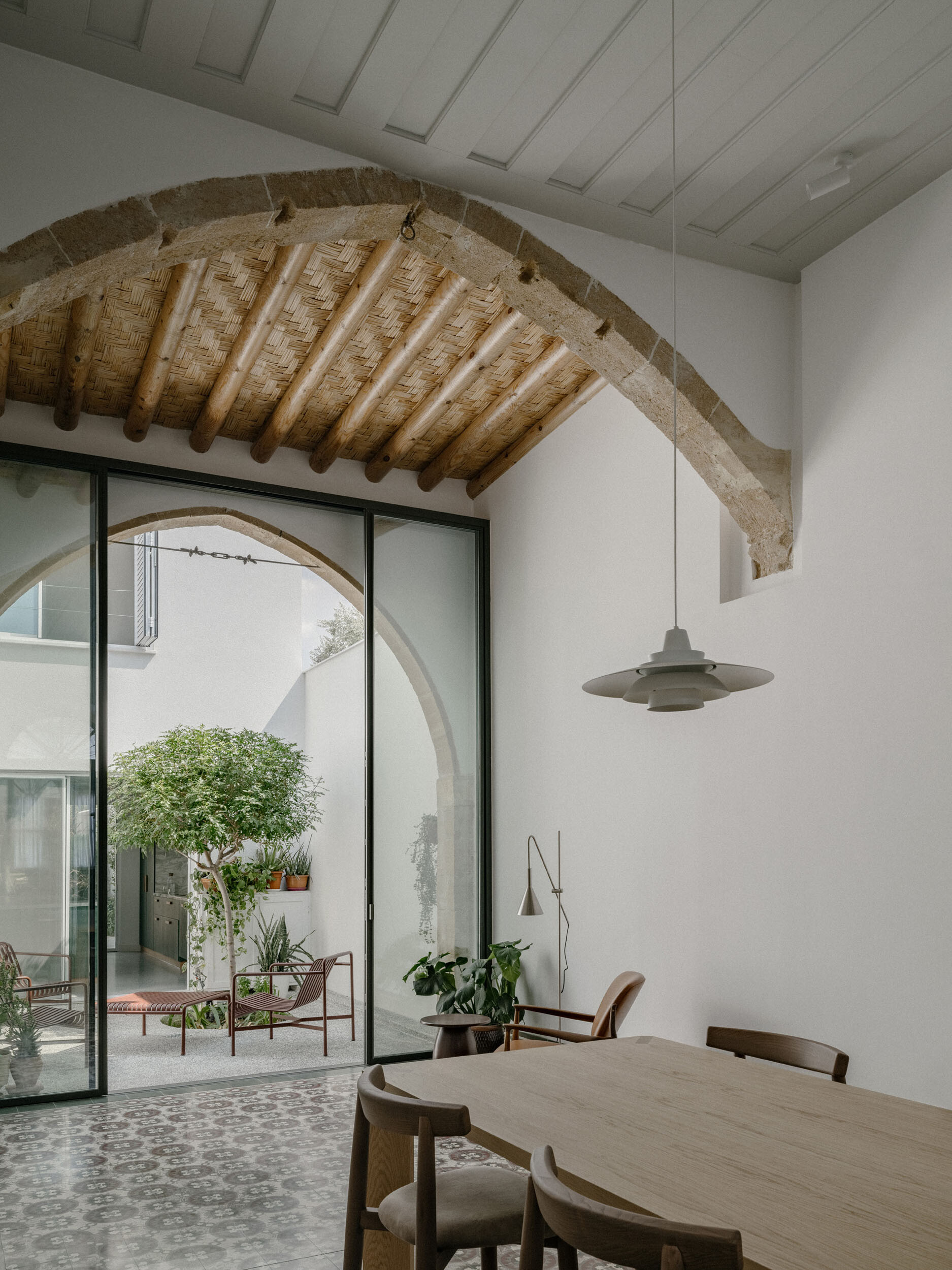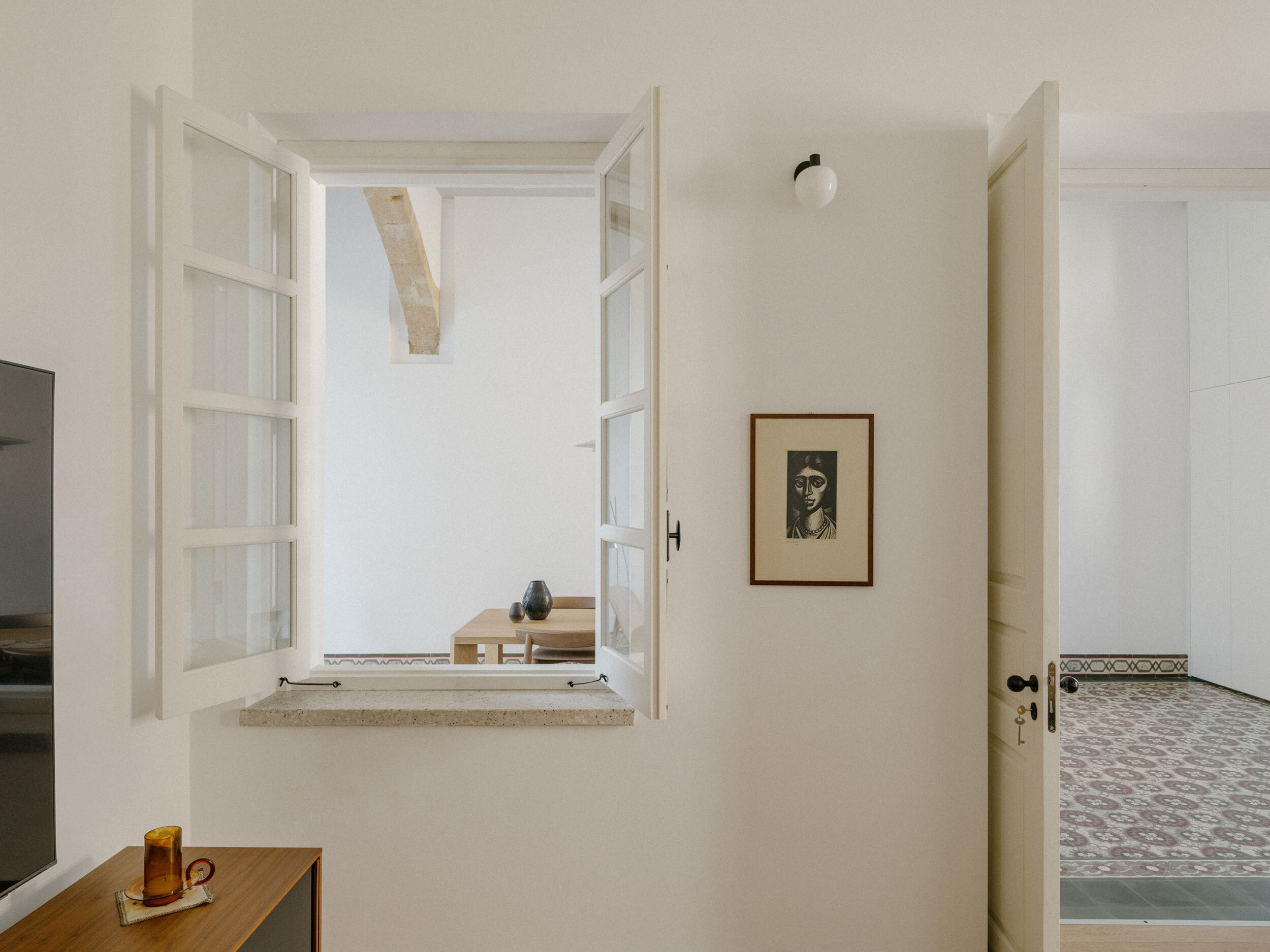 Os materiais utilizados mantiveram-se fiéis ao desenho original, como a reconstrução dos caixilhos de madeira e a substituição das telhas cerâmicas artesanais. A sala de entrada principal foi convertida em sala de jantar, enquanto as duas divisões adjacentes deram lugar à sala de estar e ao escritório.