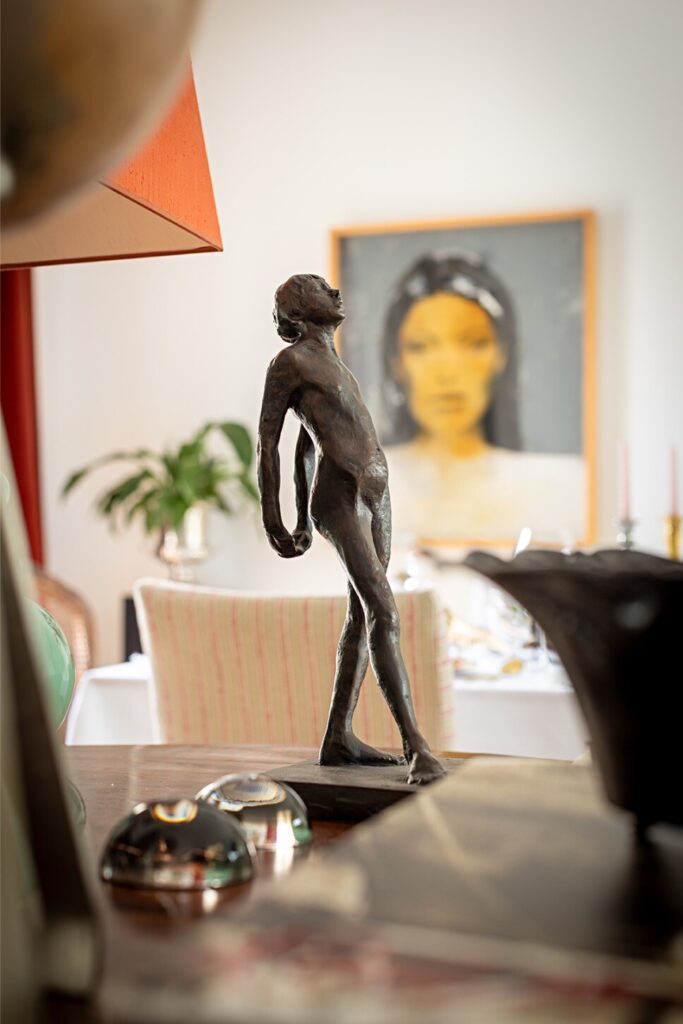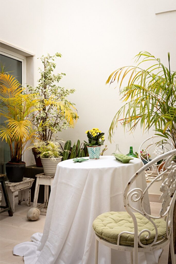 Texturas, madeiras com pátina, objetos discretos, mas com significado destacam o olhar apurado dos seus ocupantes. O plano envidraçado que ocupa uma das paredes da área de refeições deixa a luz natural entrar e permite avistar o jardim de inverno. Um pequeno oásis interior que mistura o verde das plantas com cadeiras, vasos e móveis restaurados, alguns encontrados na rua, outros em lojas de velharias e antiquários. O ambiente é boémio, afetivo, quase cinematográfico.
