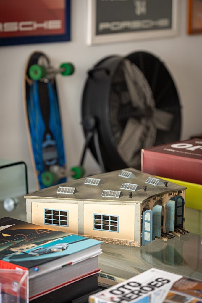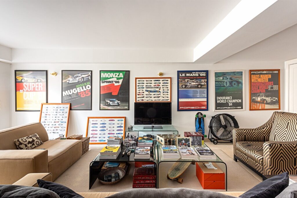 Neste mesmo piso, há ainda espaço para o quarto de um dos filhos e o acesso ao piso inferior, um espaço multiuso que conjuga trabalho, ideal para quem precisa de tempo e silêncio para pensar, escrever ou criar, apoiado por zona de estar, de TV e jogos. Generoso em área, organizado com sensibilidade masculina, este ambiente é, ainda, apoiado por uma casa de banho com as paredes revestidas de fotografias.