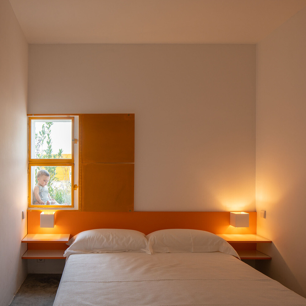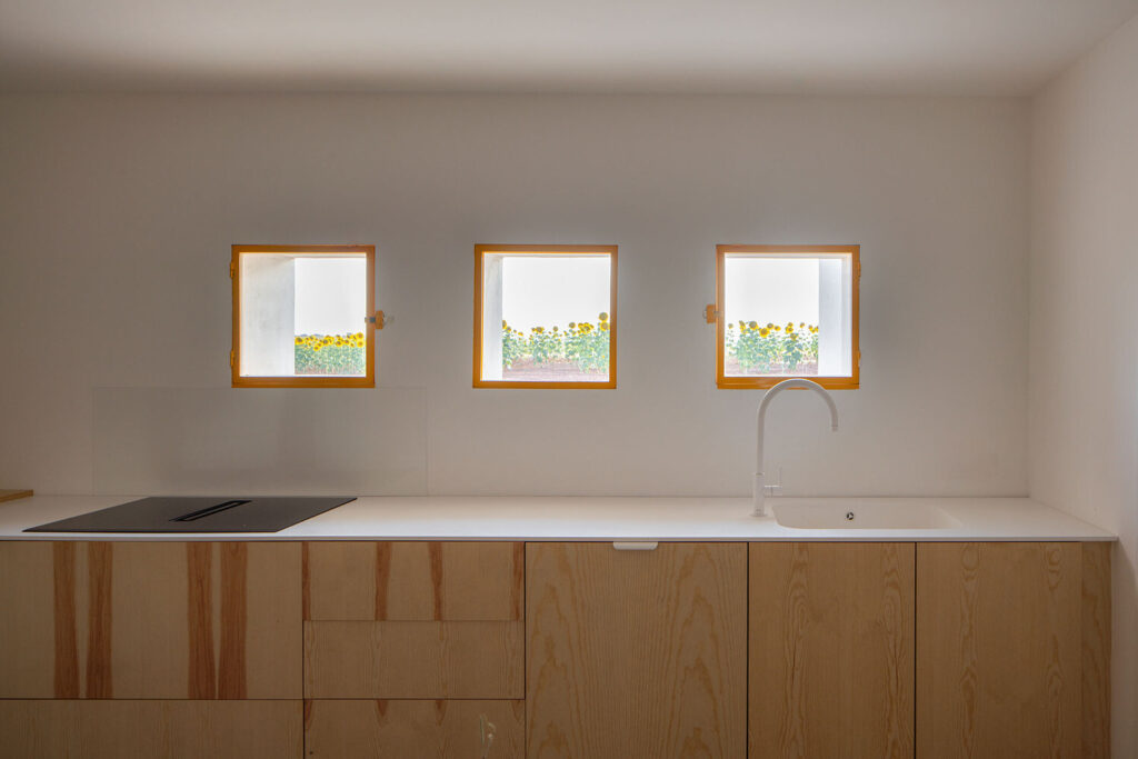 As janelas são pequenas; nos quartos, sentimo-nos quase como um coelho na sua toca. São quadradas, com 50×50 centímetros, verdadeiros quadros que enquadram a paisagem agrícola. A água necessária é captada de um poço próximo e, na ausência de fornecimento de energia, é bombada por um sistema solar fotovoltaico, que também alimenta electricidade para a casa.