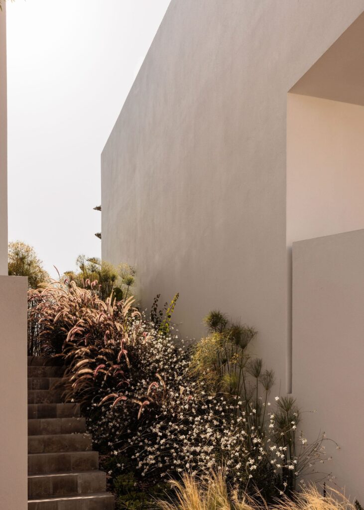Exteriormente, o piso semi-enterrado foi revestido num tom cinza claro, enquanto os volumes superiores, brancos, se libertam visualmente do terreno, acentuando a leitura dos dois pisos e a proporção do conjunto. Nos materiais, optou-se por pavimentos em madeira de carvalho americano (também aplicada nas escadas), microcimento no piso inferior e pedra natural nos terraços, pátios e piscina. Nichos e caixas de luz embutidas pontuam os espaços interiores, criando ambiências quentes e equilibradas.