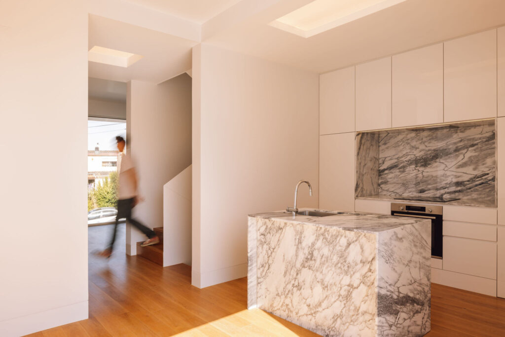 No piso térreo, correspondente à entrada pedonal, um pequeno hall é delimitado por um volume solto que integra a instalação sanitária social e oculta a escada que liga os três níveis. De um lado, a cozinha aberta prolonga-se para a sala de jantar e, graças a um vão de sacada tipo pocket, estende-se até ao jardim e à piscina a tardoz, num diálogo contínuo entre interior e exterior.