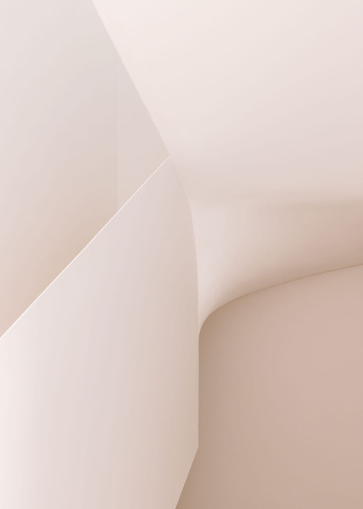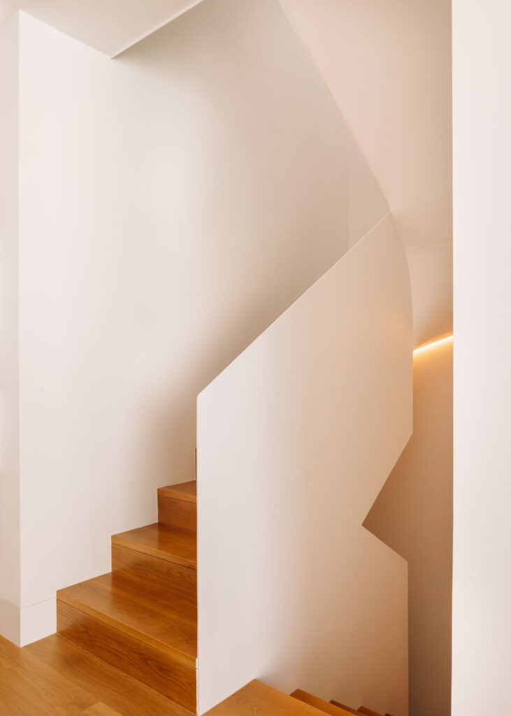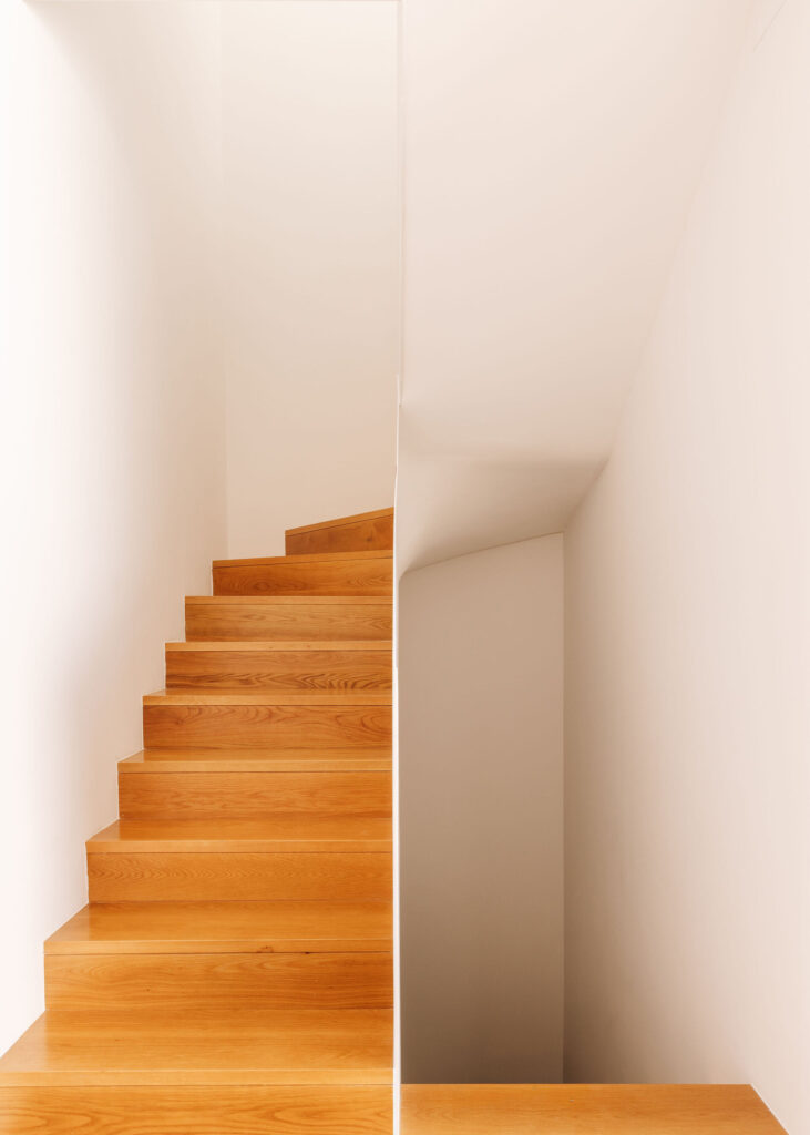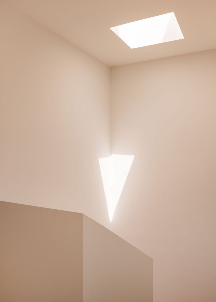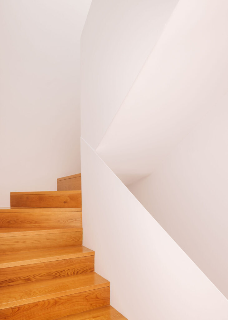 A escada central culmina num lanternim zenital que banha o núcleo vertical de circulação de luz natural ao longo do dia, transformando a percepção do espaço com o movimento do Sol. As instalações sanitárias, também iluminadas por aberturas zenitais, reforçam esta atmosfera de luminosidade suave e controlada.