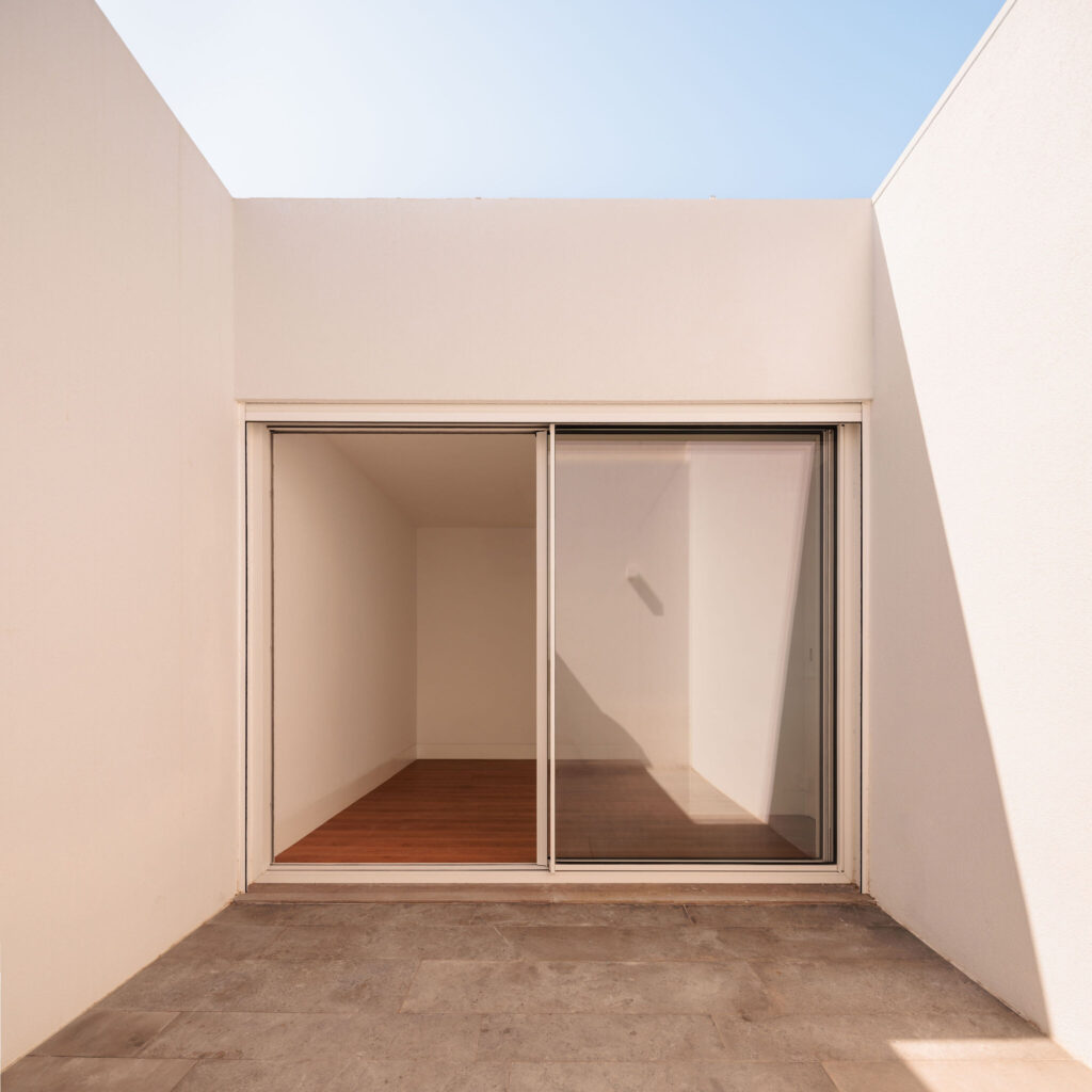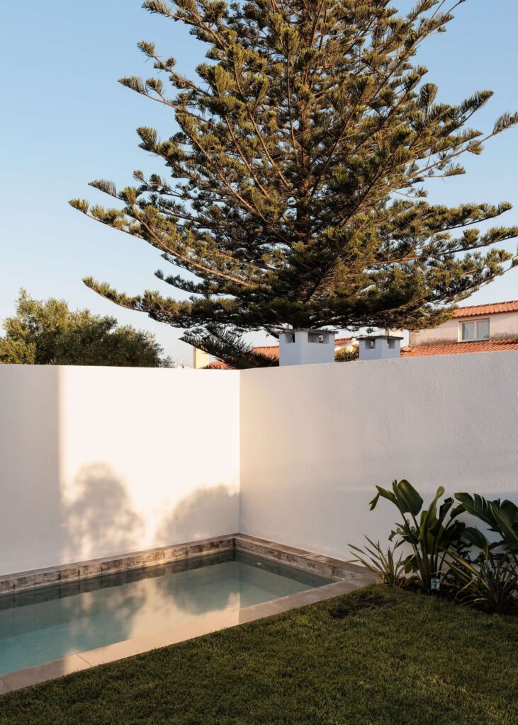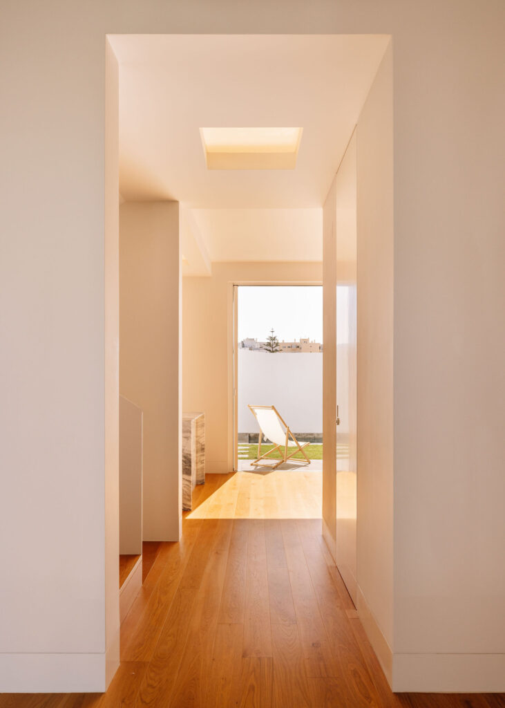 O piso superior concentra a área privada: uma suite e dois quartos servidos por uma instalação sanitária partilhada. A suite e um dos quartos abrem para o vazio atravessado pela árvore, enquanto o terceiro quarto, virado a tardoz, comunica com um pátio privado e intimista, concebido como espaço de recolhimento e serenidade.