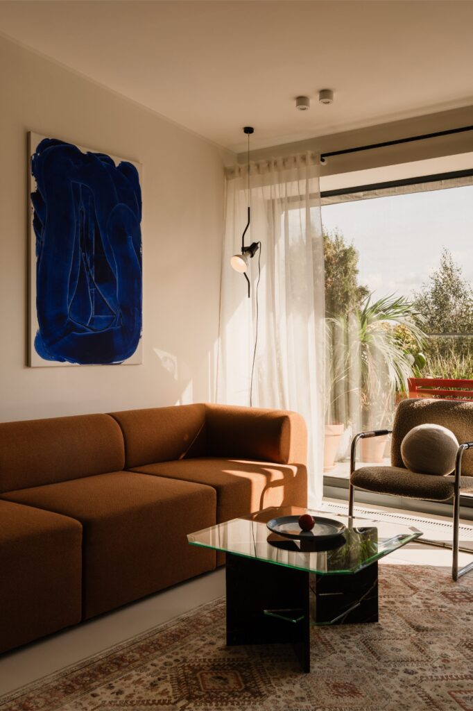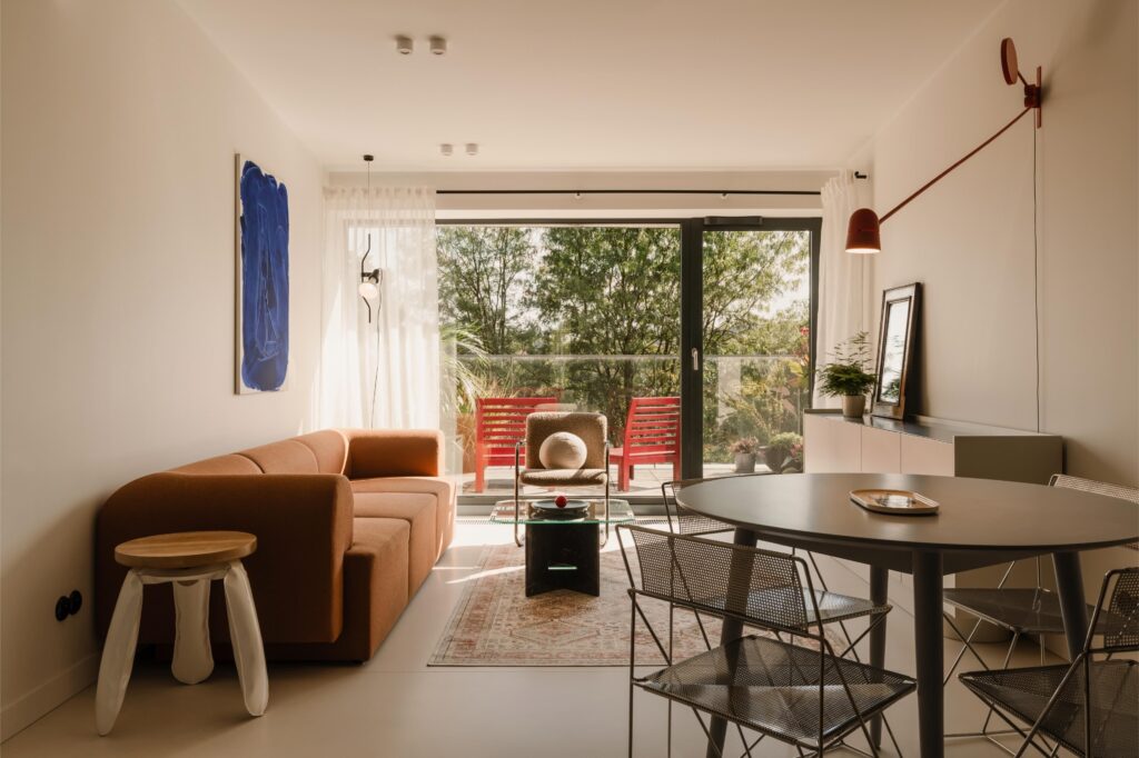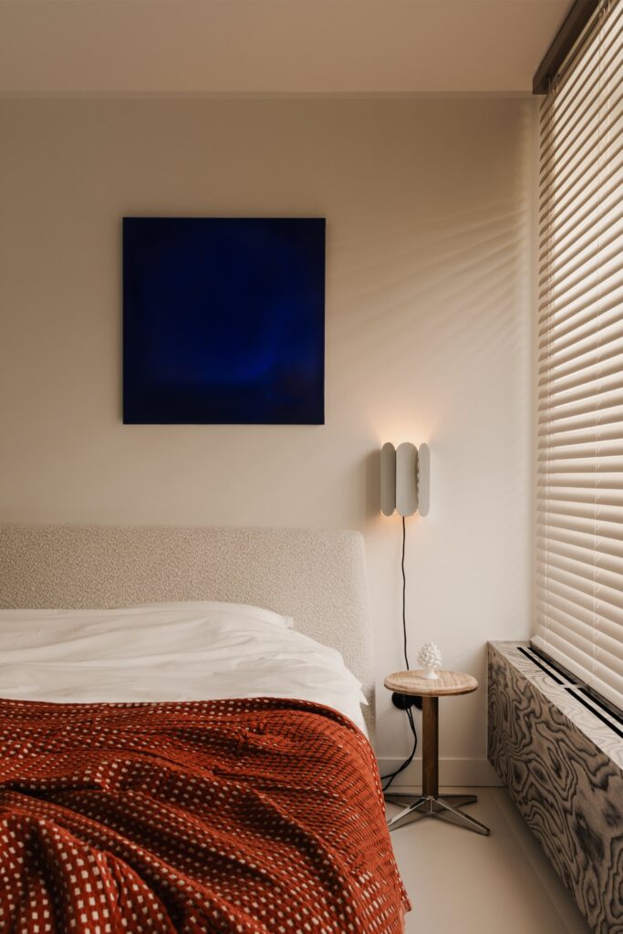 Neste interior despojado de ornamentos, há espaço para arte contemporânea. Sobre a cama está uma pintura de Karolina Wasiluk; na parede oposta, uma obra do artista de Michał Sroka. Na sala, um expressivo quadro de Aleksandra Toborowicz completa a composição.