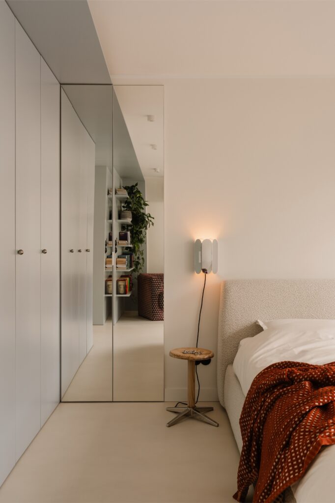 A percepção de continuidade espacial é sobretudo conseguida pelo pavimento contínuo em microcimento claro, enquanto uma parede espelhada no hall de entrada oculta a porta da casa de banho e amplifica a noção de espaço, acrescentando um toque subtilmente surreal.